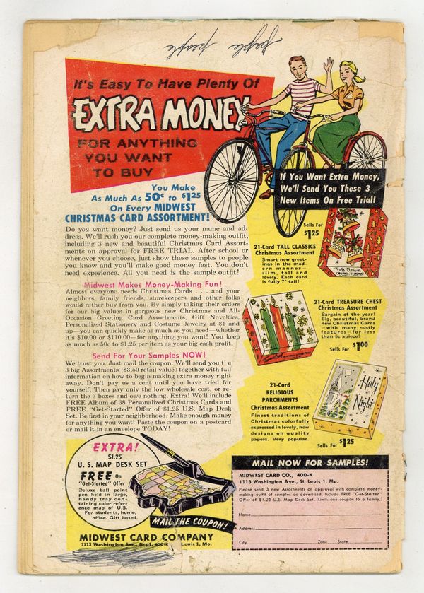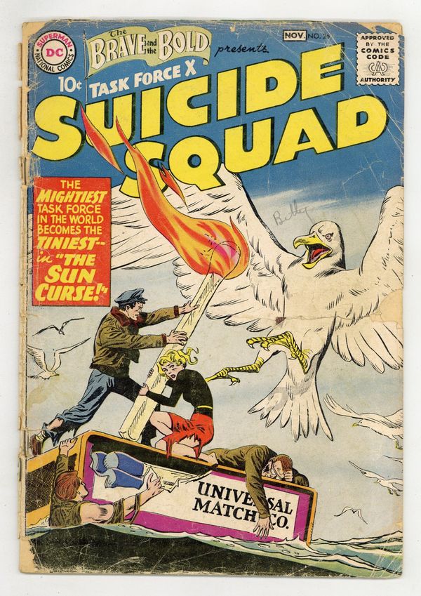 Cover pencils by Ross Andru, inks by Mike Esposito. The second appearance of the Suicide Squad in "The Sun Curse!", script by Robert Kanigher, pencils by Ross Andru, inks by Mike Esposito; Still in space from their last adventure, the Suicide Squad's rocket enters into a meteor storm; Somehow, the radiation off the flying debris affect the team, and they find themselves shrinking in size until they're no bigger than a thimble!; With quick-thinking, they form a human pyramid so Karin can reach the control panel and switch to auto-pilot before the rocket flies out of control; The rocket plunges into a vast lake somewhere on Earth, and the Squad is ejected out into the depths where their small size makes the fish think they're food. "Serpent in the Subway!", script by Robert Kanigher, pencils by Ross Andru, inks by Mike Esposito; When the members of Suicide Squad take a furlough to Paris, they don't expect to be attacked by a giant serpent in the subway tunnels!; Bullets don't have any effect on it, and it seems able to breathe both on land and underwater. 36 Pages, Full Color. Cover price $0.10.