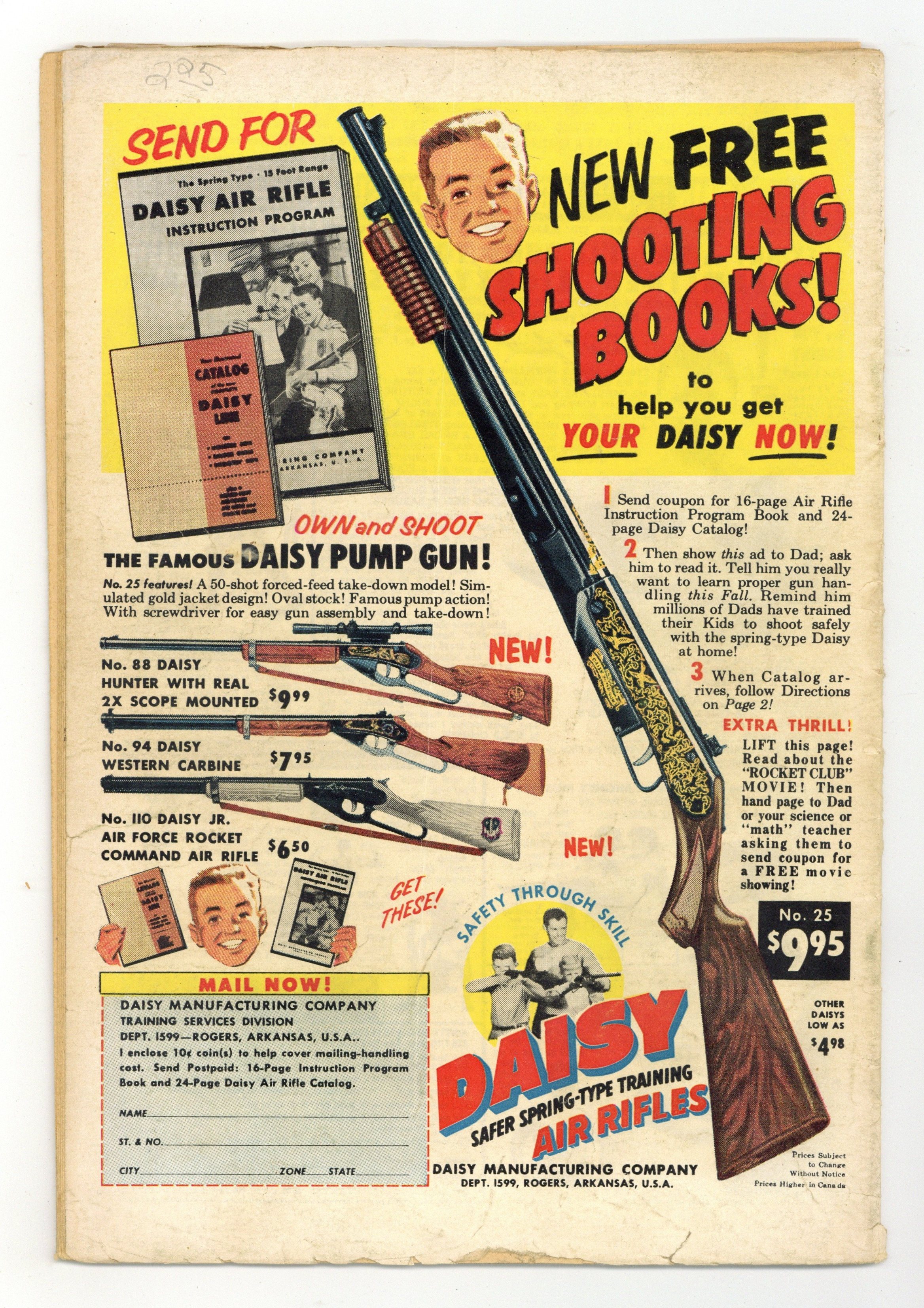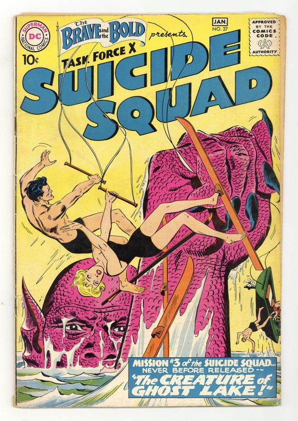 Cover pencils by Ross Andru, inks by Mike Esposito. Mission #3 of the Suicide Squad - never before released - "The Creature of Ghost Lake," script by Robert Kanigher, pencils by Ross Andru, inks by Mike Esposito; Dr. Duane is missing, apparently having created a formula that grows things to giant size; Headquarters fears that Dr. Duane has been captured by enemy agents, and orders Suicide Squad to investigate unofficially; The team books into a nearby resort so as to search surreptitiously; A giant monster seizes both Karin and a nuclear bomb being tested with a time device. The Atom Servant of Man public service announcement; Various scientists around the world demonstrate uses of radio-isotopes. The Menace of the Driver Ants! article. Robot Bombs Over London! article; Description of V-1 bombs and the German attacks on London. 36 Pages, Full Color. Cover price $0.10.