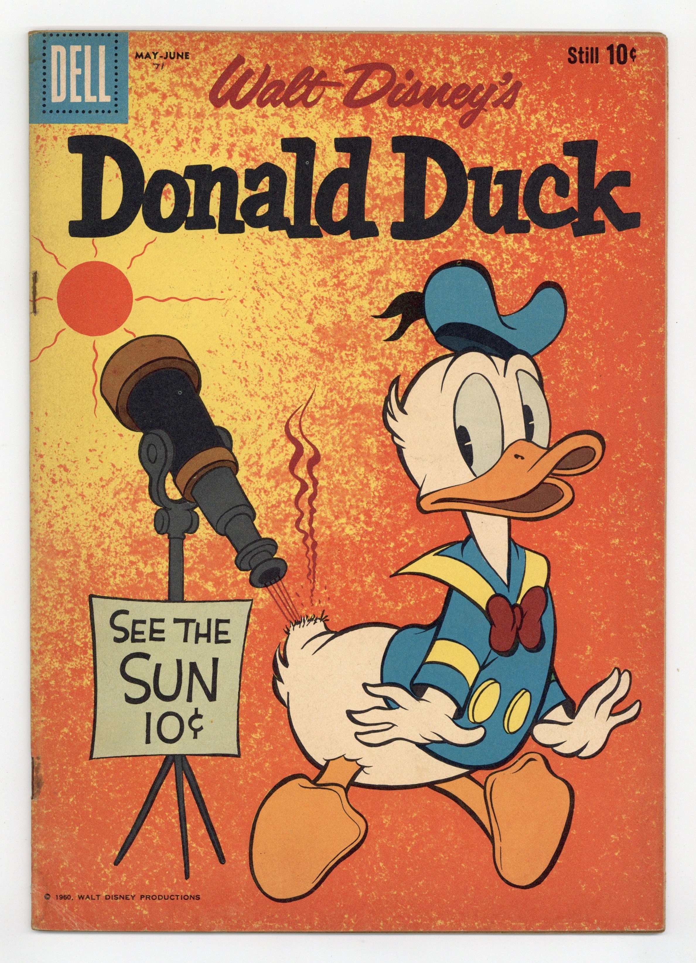 Cover by Carl Barks. Stories and art by Carl Barks, Tony Strobl, John Liggera, and Bob Gregory. The classic adventures of Disney's Donald Duck, featuring art by Carl Barks and other great Disney artists. Donald and his nephews follow the "Duckfoot Trail" blazed by Uncle Scrooge decades earlier. Clarabelle Cow tries to teach Goofy how to be a gentleman. Huey, Dewey and Louie seek the pot of gold at the end of the rainbow, but Uncle Scrooge is ahead of the game, in a half-pager by Carl Barks. Plus a vintage ad for the "Uncle Scrooge Thrifty Bank" squeeze toy, featuring Scrooge, Huey, Dewey and Louie. (Note: This is the first comic book that MyComicShop founder Buddy Saunders ever bought.) The Duckfoot Trail; The Carnival Caper; Goofy: Ungentle Gentleman; Sky-High Society; Huey, Dewey and Louie: Rainbows End. 32 pages, Full Color. Cover price $0.10.