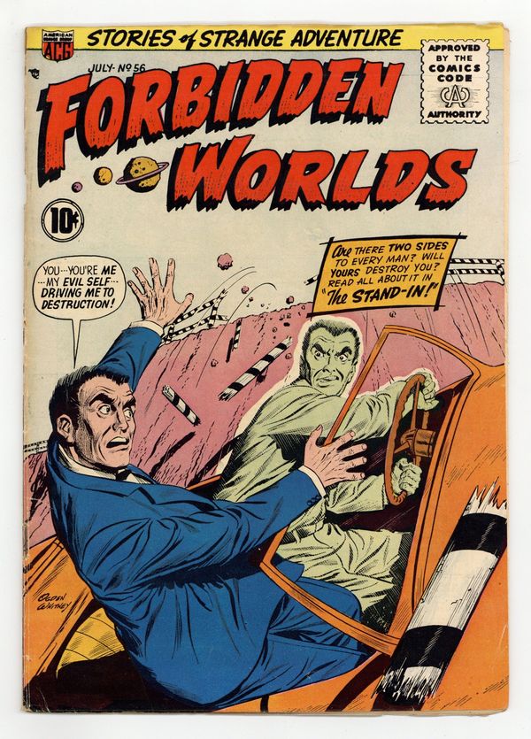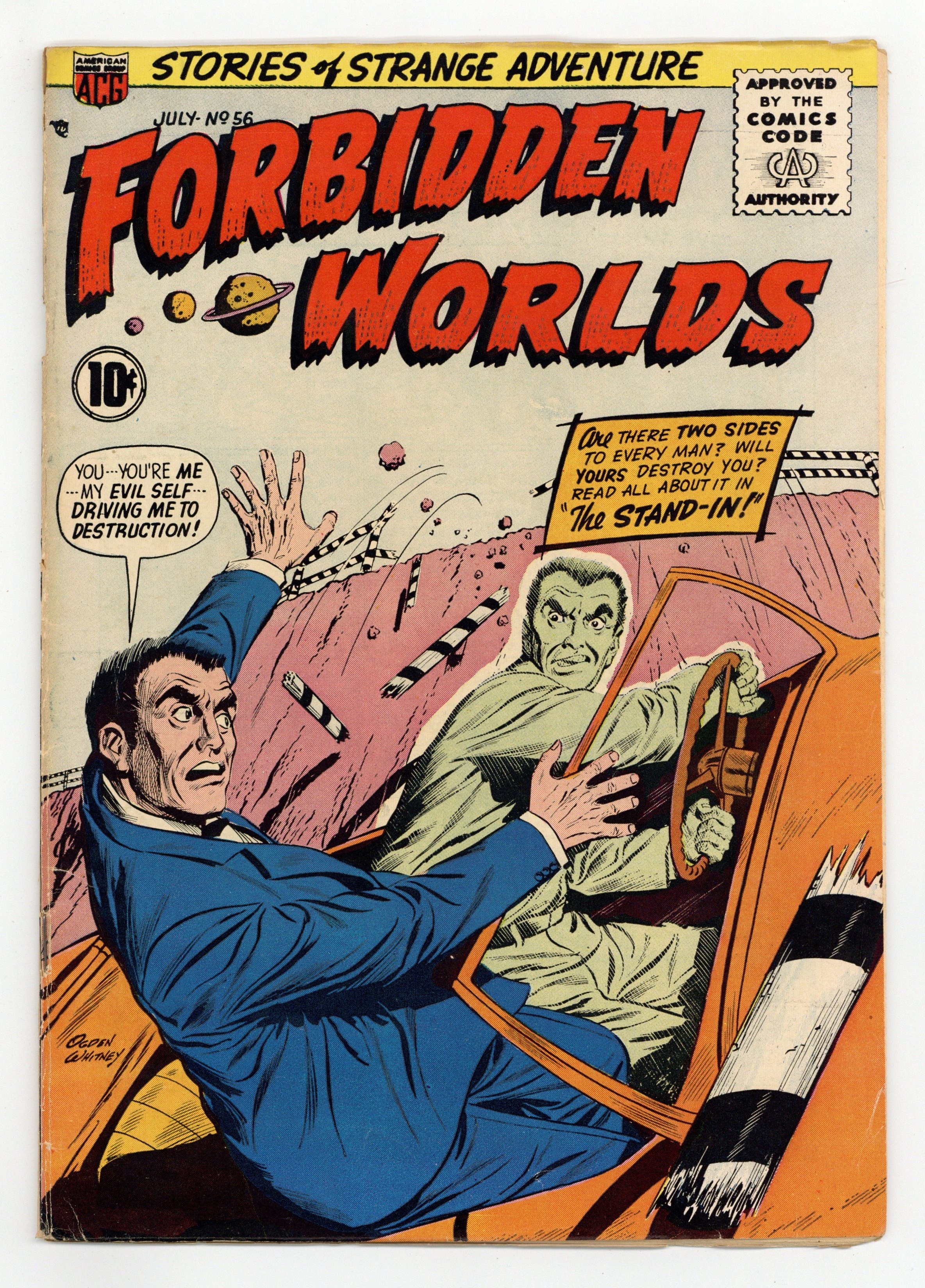 Cover by Ogden Whitney. Edited by Richard E. Hughes. Art by John Rosenberger, Kurt Schaffenberger and Ogden Whitney. An anthology series featuring tales of fantasy and science fiction adventure from legendary early independent comics publisher ACG. A man meets his evil duplicate, who is trying to do away with him; A boy orphaned during World War II has detailed visions of his parents lives; During sunspot activity, an astronomers new TV set starts picking up broadcasts from another planet. Art by Superman and Lois Lane artist Kurt Schaffenberger. The Stand-In!; Medieval Dagger; The Ardsley Incident!; Jockey on Future!; Famous Mediums! No. 1: Daniel Dunglas Home; Channel X! 32 pages, Full Color. Cover price $0.10.