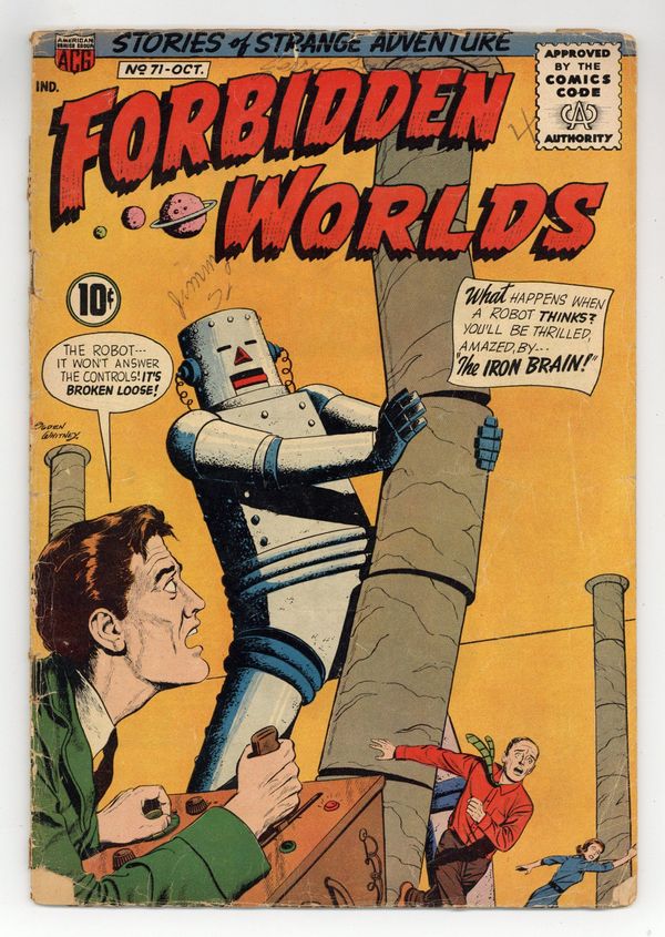 Cover by Ogden Whitney. Edited by Richard E. Hughes. Art by Mike Roy, Bob Jenney and John Rosenberger. An anthology series featuring tales of fantasy and science fiction adventure from legendary early independent comics publisher ACG. Arthur Lansing is given a mirror that foretells the future, but only to those who are pure of heart; A giant robot learns to think for itself, leading to a turn of events absolutely everyone could have foreseen; A visiting UFO accidentally leaves behind an alien virus that threatens to wipe out humankind. The Mirror of Mowgladi!; Superstitious Notes; The Alien Germs!; The Iron Brain! 32 pages, Full Color. Cover price $0.10.