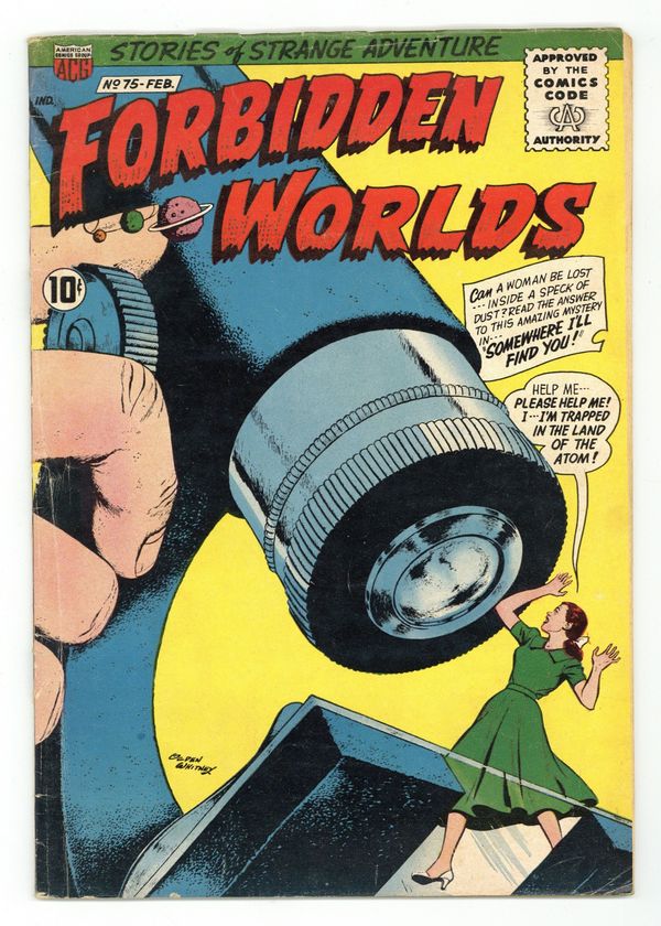 $17.50Cover art by Ogden Whitney. "Legend of the Clock!" starring Gary, Mr. Janero, Duke De Bascon, Marquis Duchamps, Monsieur Lechat, Aline and Rene, script by Richard Hughes (as Jonathan Burns), art by John Buscema. "The House of Tomorrow!", script by Richard Hughes (as Shane O'Shea), art by John Forte; Saturnian furniture is mistaken for Bob Carter's designs, but the futuristic furniture gets better reviews that his traditional work. "Somewhere I'll Find You!" starring Lyle Gordon, Ellen, and Vincent H. Carr, script by Richard Hughes (as Bob Standish), art by Paul Reinman. "Strange Journey," script by Richard Hughes (as Thomas R. Drew), art by Ogden Whitney; Professor Bordoni's experimental car takes him to another dimension, from which he is banished as a mental case... back to Earth! 36 pgs., full color. Cover price $0.10.