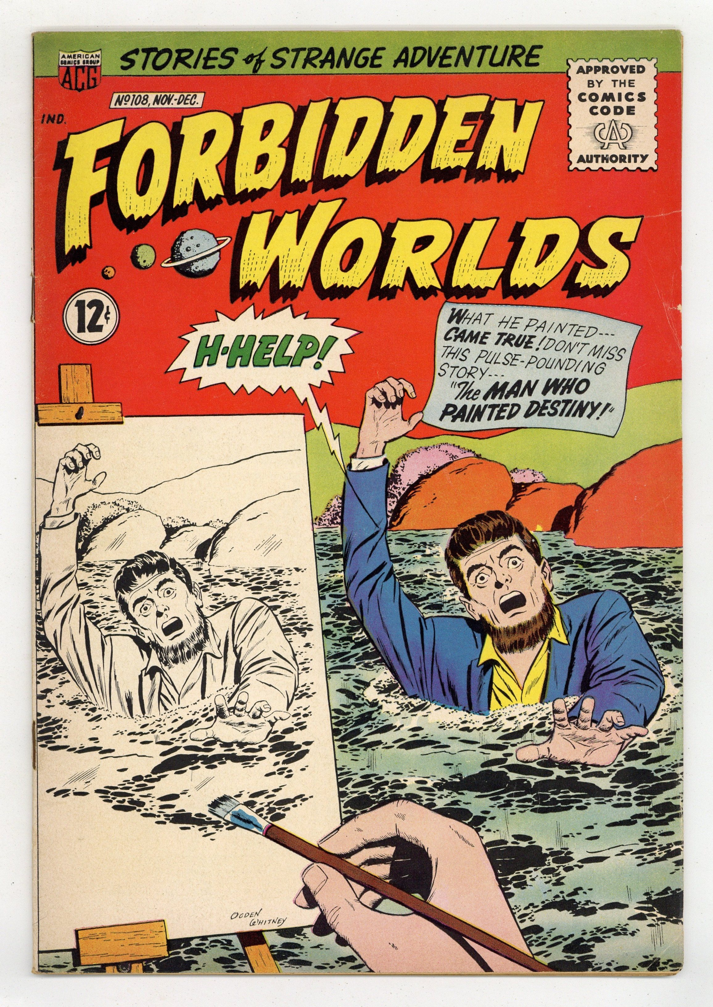 Cover by Ogden Whitney. Edited by Richard E. Hughes. Stories by Richard Hughes, credited as Pierre Alonzo and Shane O'Shea. Art by Leo Morey, Ogden Whitney, Tom Hickey and Paul Reinman. An anthology series featuring tales of fantasy and science fiction adventure from legendary early independent comics publisher ACG. A coward is drafted for a fake space mission, but accidentally gets sent to an alien civilization; An inventor creates a cigarette filter that transports him one day into the future every time he uses it; A painter is able to capture future events in his paintings. Space Sissy!; Facing the Future; Strange Visit; The Man Who Painted Destiny! 32 pages, Full Color. Cover price $0.12.