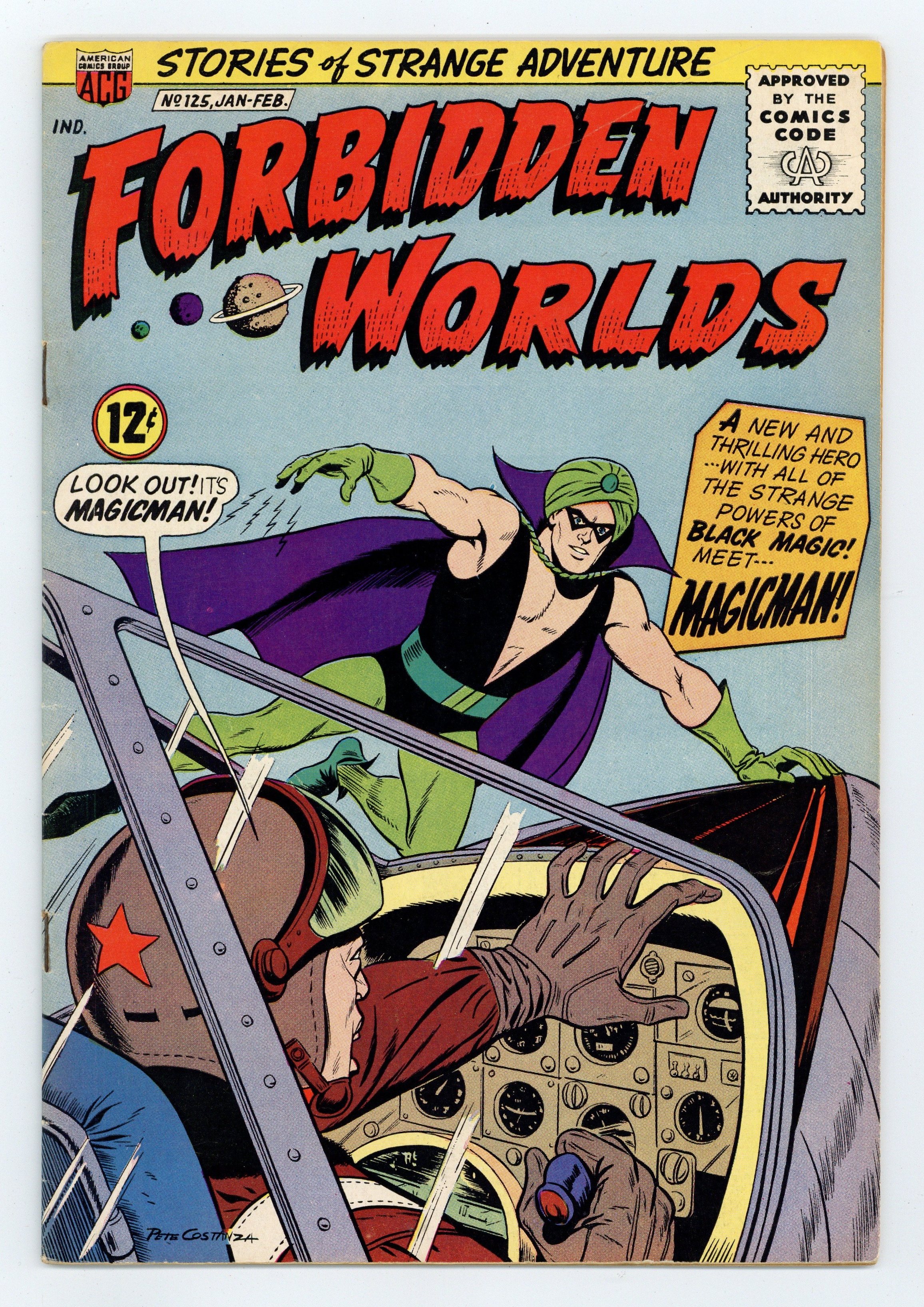 Cover by Kurt Schaffenberger, credited as Pete Costanza. Edited by Richard E. Hughes. Stories by Richard Hughes, credited as Zev Zimmer. Art by Pete Costanza, Kurt Schaffenberger and George Wilhelms. An anthology series featuring tales of fantasy and science fiction adventure from legendary early independent comics publisher ACG. As the Silver Age of comics begins, ACG introduces a superhero: Magicman, immortal son of the wizard Cagliostro, who disguises himself as an American soldier when not battling evil as Magicman. A modern-day man undergoes hypnosis to discover the truth about his great-grandfathers disappearance; student Willie Stover and his pet frog Oswald accidentally foil an invasion from a microscopic world during Detention. Also featuring a one-page Herbie story/ad for his new comic. Cover by Superman and Lois Lane artist Kurt Schaffenberger, working under an assumed name at the request of DCs editor. Magicman!; Missing: Frederick Forbes!; No Good to the World! 32 pages, Full Color. Cover price $0.12.