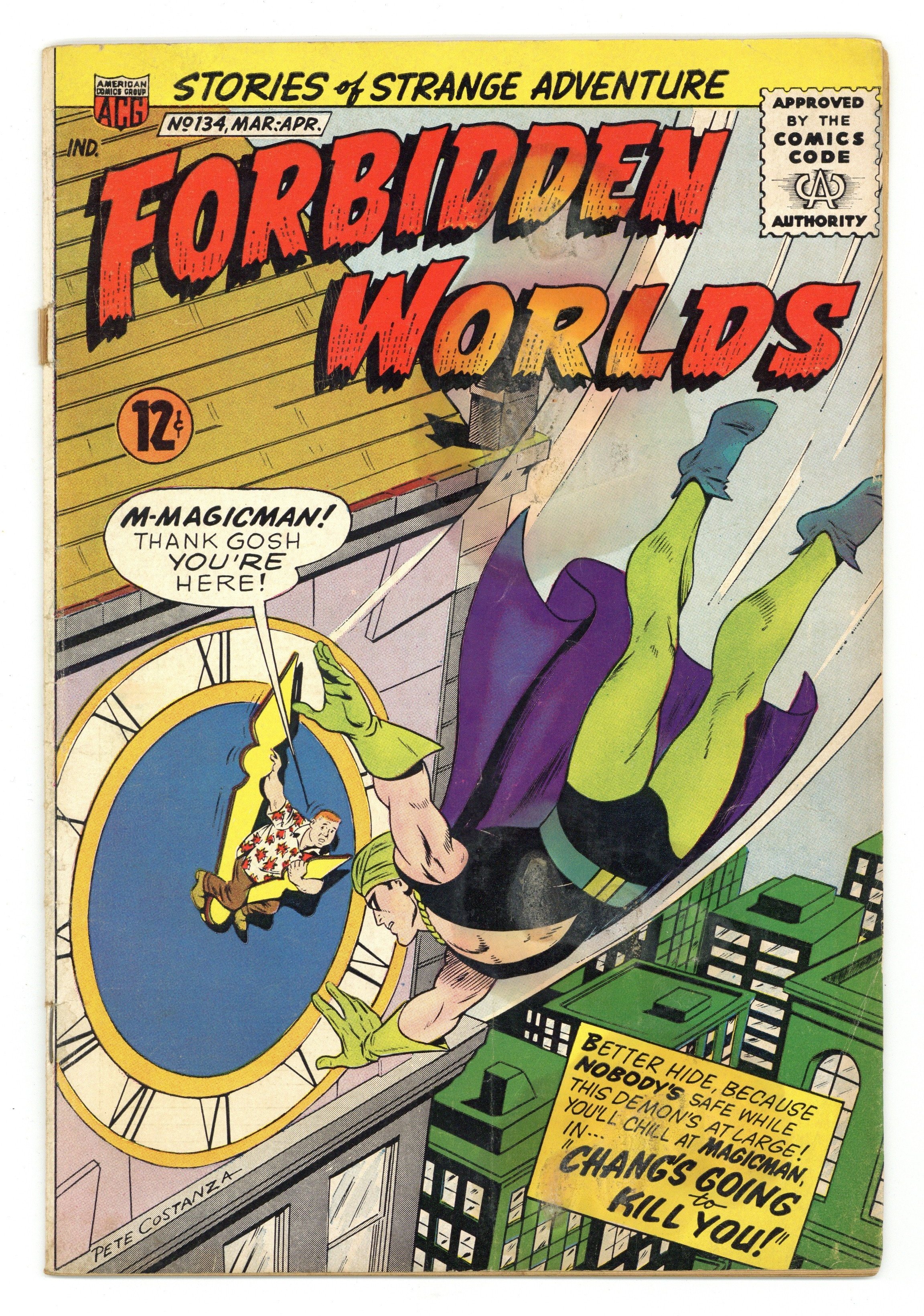 Cover by Kurt Schaffenberger, credited as Pete Costanza. Edited by Richard E. Hughes. Stories by Richard Hughes, credited as Zev Zimmer, Kurato Osaki and Greg Olivetti. Art by Pete Costanza, John Rosenberger and Hy Eisman. An anthology series featuring tales of fantasy and science fiction adventure from legendary early independent comics publisher ACG. Magicman has to stop the deadly spy Chang, but no one alive has seen his face; Marty tries to figure out how to help his girlfriend's uncle, who has turned invisible in a lab accident; A man witnesses a fifty-year-old crime at an old service station on a deserted road. Cover by Superman and Lois Lane artist Kurt Schaffenberger, working under an assumed name at the request of DCs editor. Chang's Going to Kill You!; The Vanishing Uncle!; The Ghostly Garage! 32 pages, Full Color. Cover price $0.12.