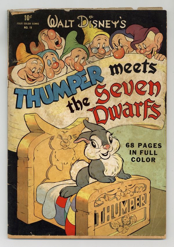 Indicia title is "WALT DISNEY'S THUMPER MEETS THE SEVEN DWARFS, No. 19." Cover art by Carl Buettner. Thumper Meets the Seven Dwarfs, script and art by Carl Buettner; Thumper goes on a quest to find the "end of the world"; He falls in a hole, which leads to the Seven Dwarfs' diamond mine; After spending the night at the Dwarfs' house, Thumper takes a drink from a "wishing well"; Thumper wishes to meet a giant and is captured by one; He is taken to the giant's castle to be kept as a pet; Thumper wishes for Doc and Dopey to help him and they magically appear in the castle and help him escape; After a series of adventures, Thumper wishes the trio was back in the Dwarfs' house. Reprinted in Silly Simphonies. 68 pages, full color. Cover price $0.10.