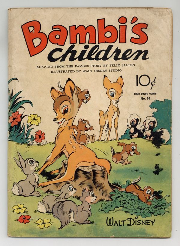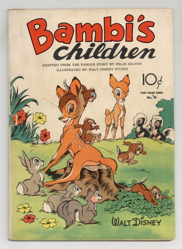 Indicia title is "BAMBI'S CHILDREN, No. 30." Cover art by Ken Hultgren. Bambi's Children, script by Felix Salten (original story), art by Ken Hultgren; The adventures of the children of Bambi and Faline (Gino and Gurri), Thumper (Hopper and Patter), and Flower (Buttercup and Primrose). Map of the Forest filler page, art by Ken Hultgren. Back cover portrait-style illustration of Bambi with his children Geno and Gurri, art by Ken Hultgren. 60 pages, full color. Cover price $0.10.