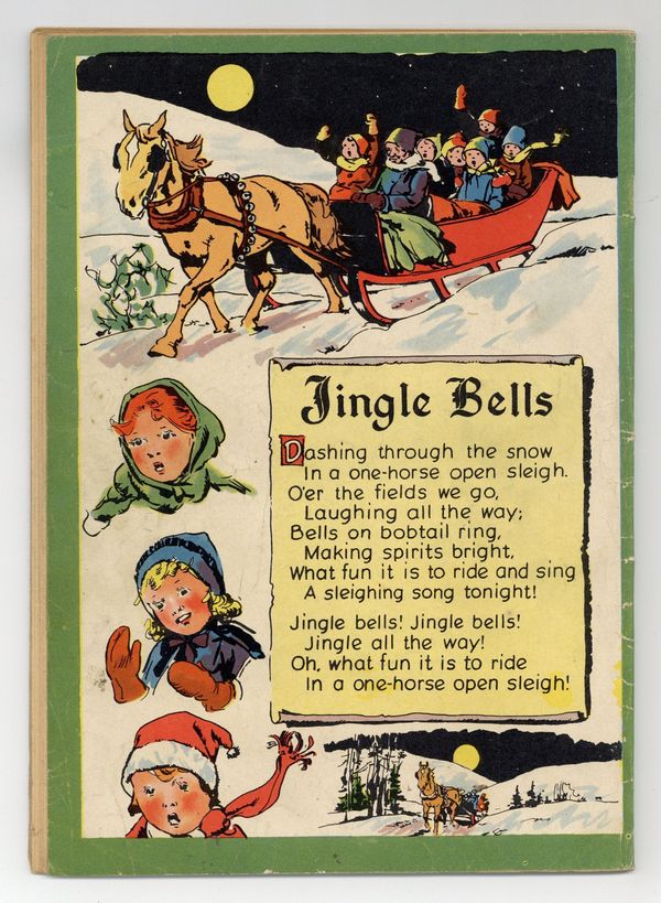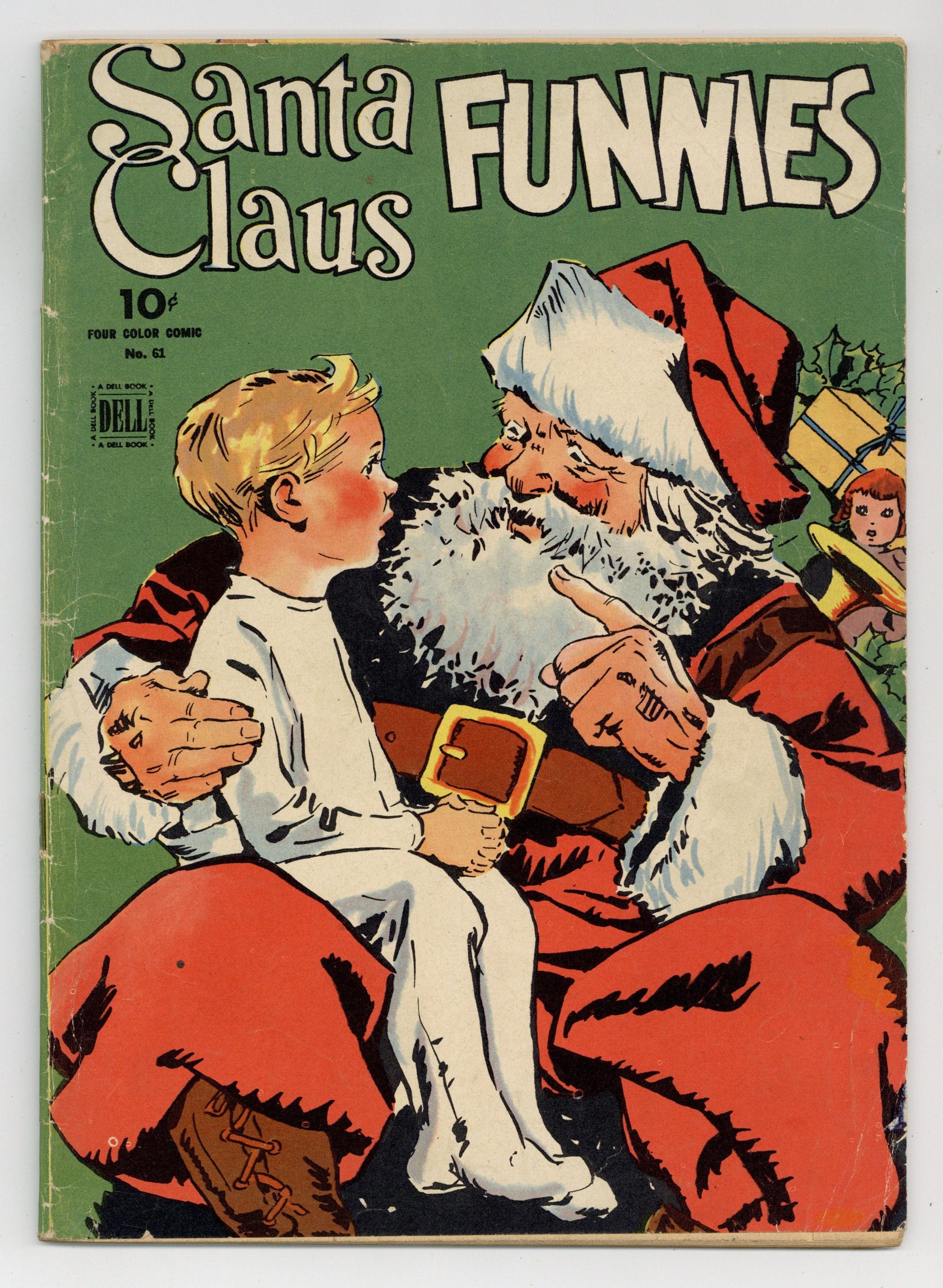 Indicia title is "SANTA CLAUS FUNNIES, No. 61." Cover art by Arthur E. Jameson. How Santa Got His Red Suit, script and art by Walt Kelly; Years ago, Santa did not always wear a red suit; One Christmas eve, Jack Frost steals his sleigh and toys and leaves Santa stranded; He finds refuge at a tiny house full of elves. The Night Before Christmas, script by Clement Clark Moore, art by Arthur E. Jameson; The poem "A Visit from St. Nicholas." Miracle in the Wildwood, script by Gaylord Du Bois, art by Arthur E. Jameson; Two quarrelsome knights divide the village of Benn in half; As time goes by the village falls away from the Christian religion and becomes a cruel, violent place. 52 pages, full color. Cover price $0.10.