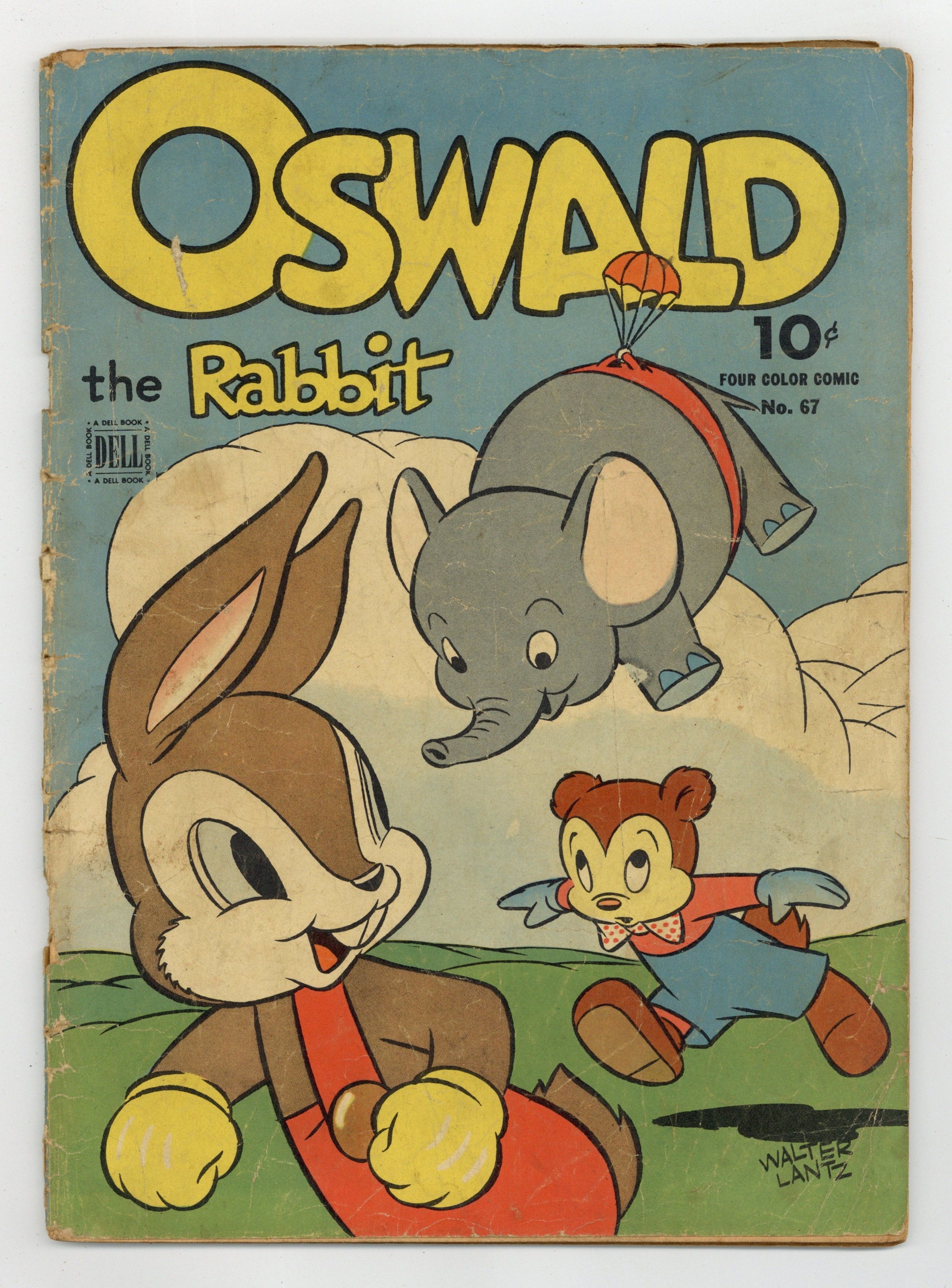 $12.00Indicia title is "OSWALD THE RABBIT, No. 67." Cover art by Dan Gormley. Untitled Oswald the Rabbit story, script by John Stanley, art by Lloyd White; Oswald and Toby fall into a deep hole at the top of a mountain and end up in a strange land; Oswald and Toby are jailed when Toby accidentally picks the last flower in the kingdom. The Secret Six, script by John Stanley, art by Lloyd White; D. J. Rarebit, the president of a large company, is threatened by "The Secret Six"; He hires Oswald to impersonate him in hopes that the gang will "knock off" Oswald and think it was him. 52 pages, full color. Cover price $0.10.