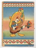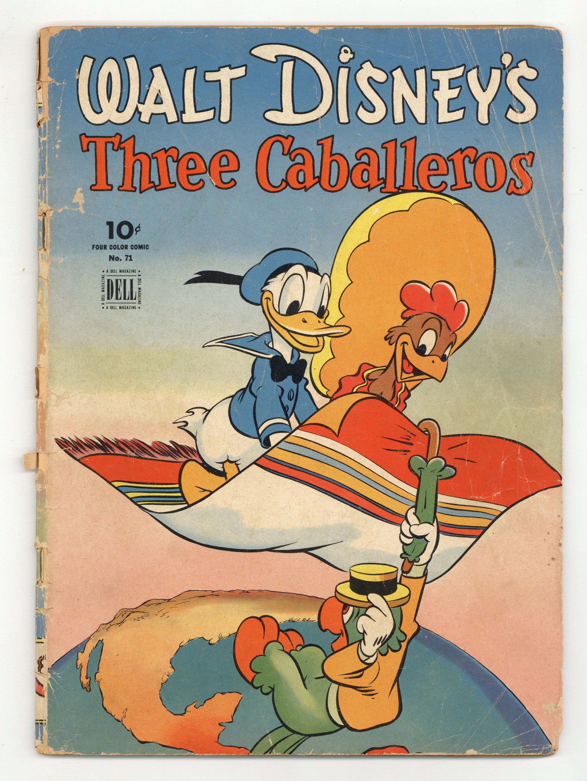 Indicia title is "WALT DISNEY'S THREE CABALLEROS, No. 71." Cover art by Walt Kelly. Surreal drawing of Donald with two children on a pony covered in a flower design with various animals as a border on inside front cover, by Walt Kelly. The Three Caballeros, script and art by Walt Kelly; José Carioca and Panchito take Donald on a magic flying serape tour of Latin America; Along the way they hear the stories of Pablo the Penguin, the gauchito and the flying burro, and "Las Posadas" and the pinata. Decorated map of a railroad's track winding through the jungle, art by Walt Kelly. Donald Playing Guitar back cover strip by Walt Kelly. 52 pages, full color. Cover price $0.10.