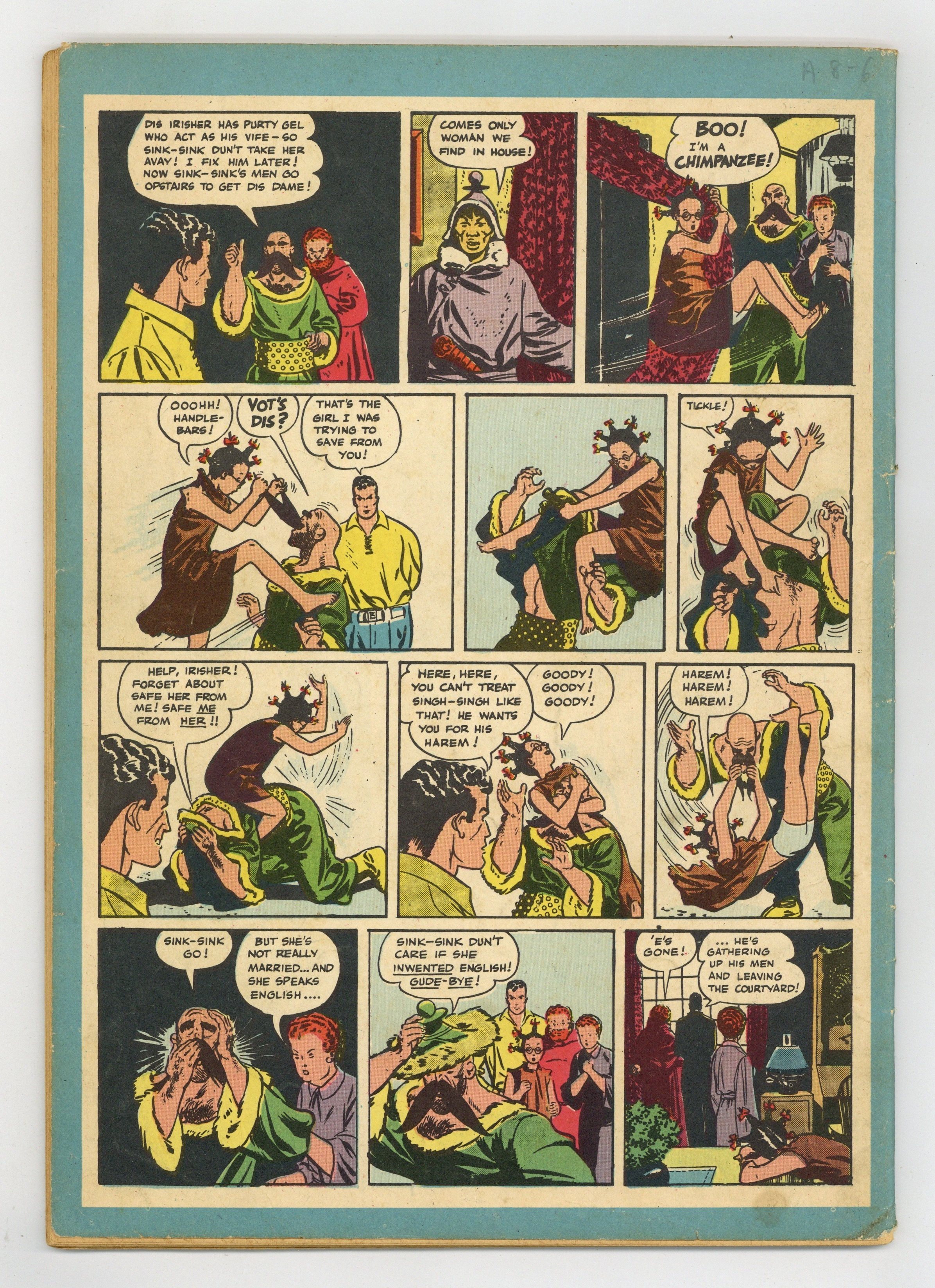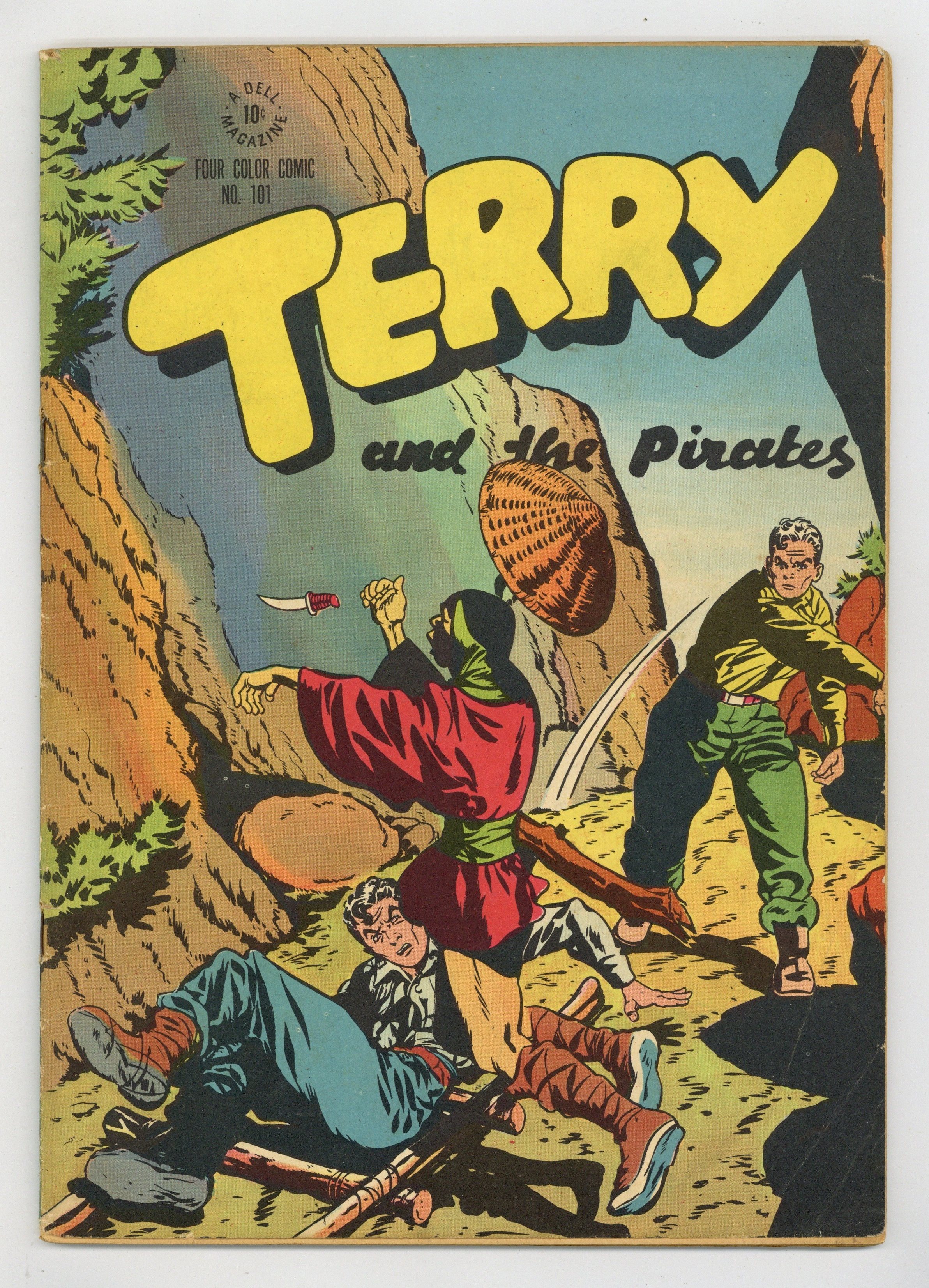 $39.50Indicia title is "TERRY AND THE PIRATES, No. 101." Cover art by Milton Caniff. Untitled story, script and art by Milton Caniff; The Dragon Lady and her guerrillas are engaged in one of their frequent battles with the invader; Terry, April Kane, and Deeth Crispin are her not-too-willing guests, Pat, Connie, and Big Stoop are traveling with the invader as neutrals, while looking for Terry and his friends. Reprinted from "Terry and The Pirates" (News Syndicate Co., Inc.) newspaper comic strips from 1939-1940. 52 pages, full color. [Note: Number 101 is the last issue to carry the "Four Color" logo on cover; all issues beginning with number 100 are marked "...O.S" (One Shot) which can be found in the bottom left-hand panel on the first page; the numbers following "O.S." relate to the year/month issued.] Cover price $0.10.
