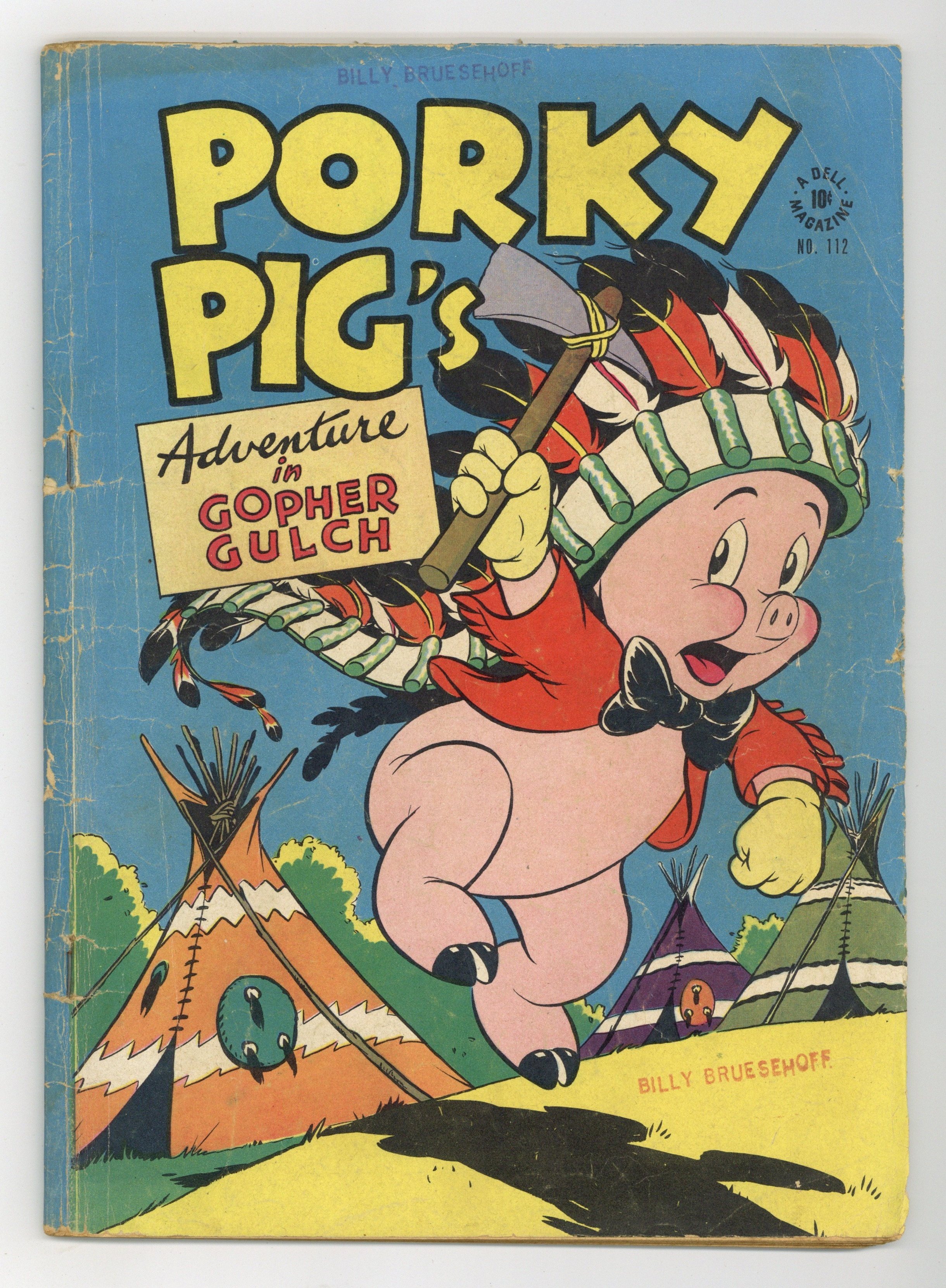 Indicia title is "PORKY PIG'S ADVENTURE IN GOPHER GULCH, No. 112." Cover art by Carl Buettner. Porky Pig's Adventure in Gopher Gulch, art by Tom McKimson; Porky finds a lost toupee that belongs to movie star Eric Jones. Porky Pig and the Million Dollar Mix-Up, art by Roger Armstrong; Porky is to inherit one million dollars from the estate of his uncle Hog Brissels. Porky Pig's Masquerade, art by Carl Buettner; Petunia is to start work at a new job, but was already scheduled to work a charity bazaar and deliver a cake to Silas Pinchpenny. 52 pages, full color. Cover price $0.10.