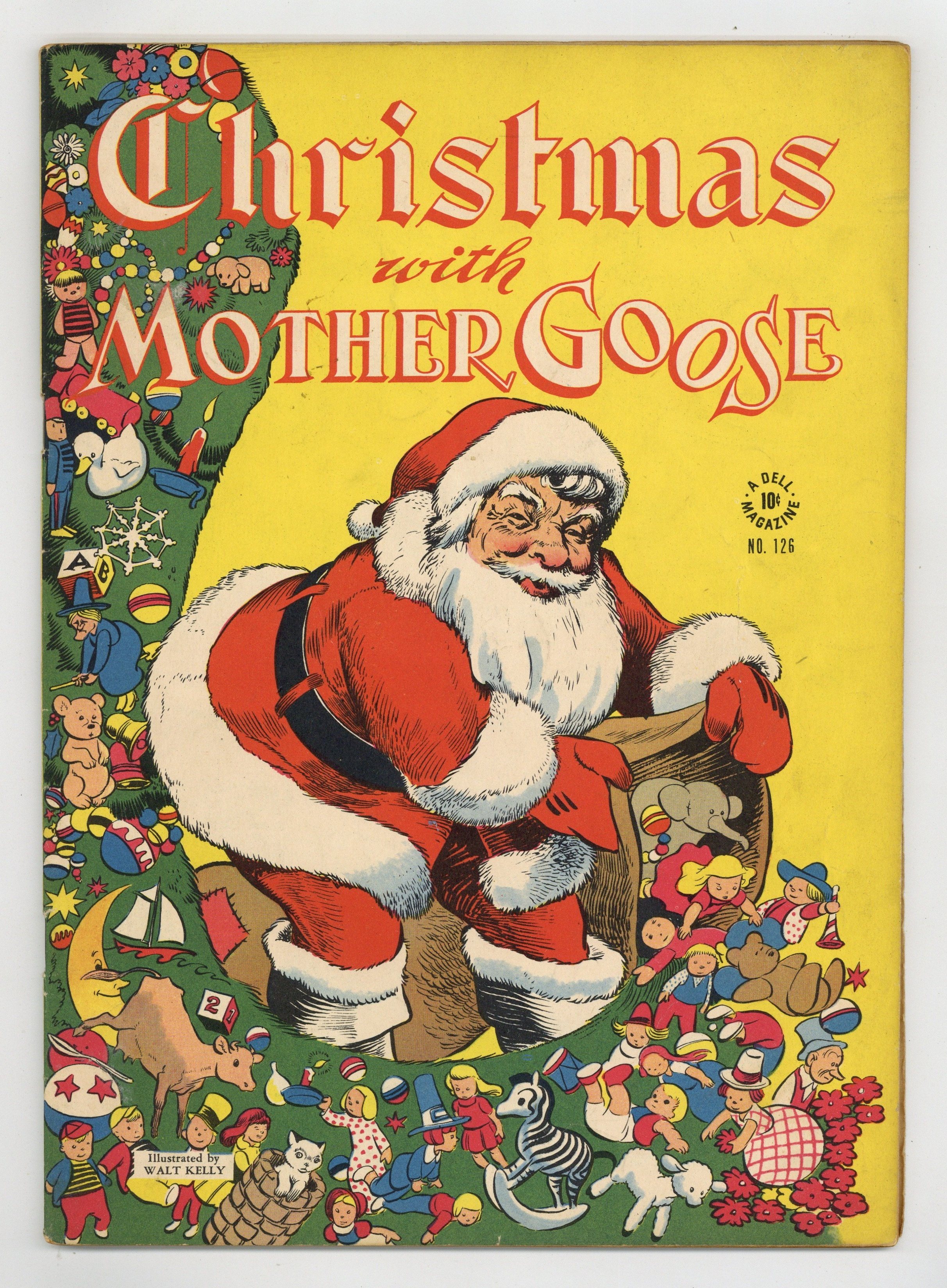 Indicia title is "CHRISTMAS WITH MOTHER GOOSE, No. 126." On the Way to the Christmas Fair; Characters from Mother Goose rhymes on their way to the fair. The Christmas Fair; Mother Goose characters at the fair. Riddles; Mother Hubbard lets the children read riddles from a book. The Night Before Christmas; An old man recites "A Visit from St. Nicholas" to some children. Old King Cole and the Limerick Game; Characters from nursery rhymes recite limericks for King Cole. Santa's Story. All art by Walt Kelly. 52 pages, full color. Cover price $0.10.