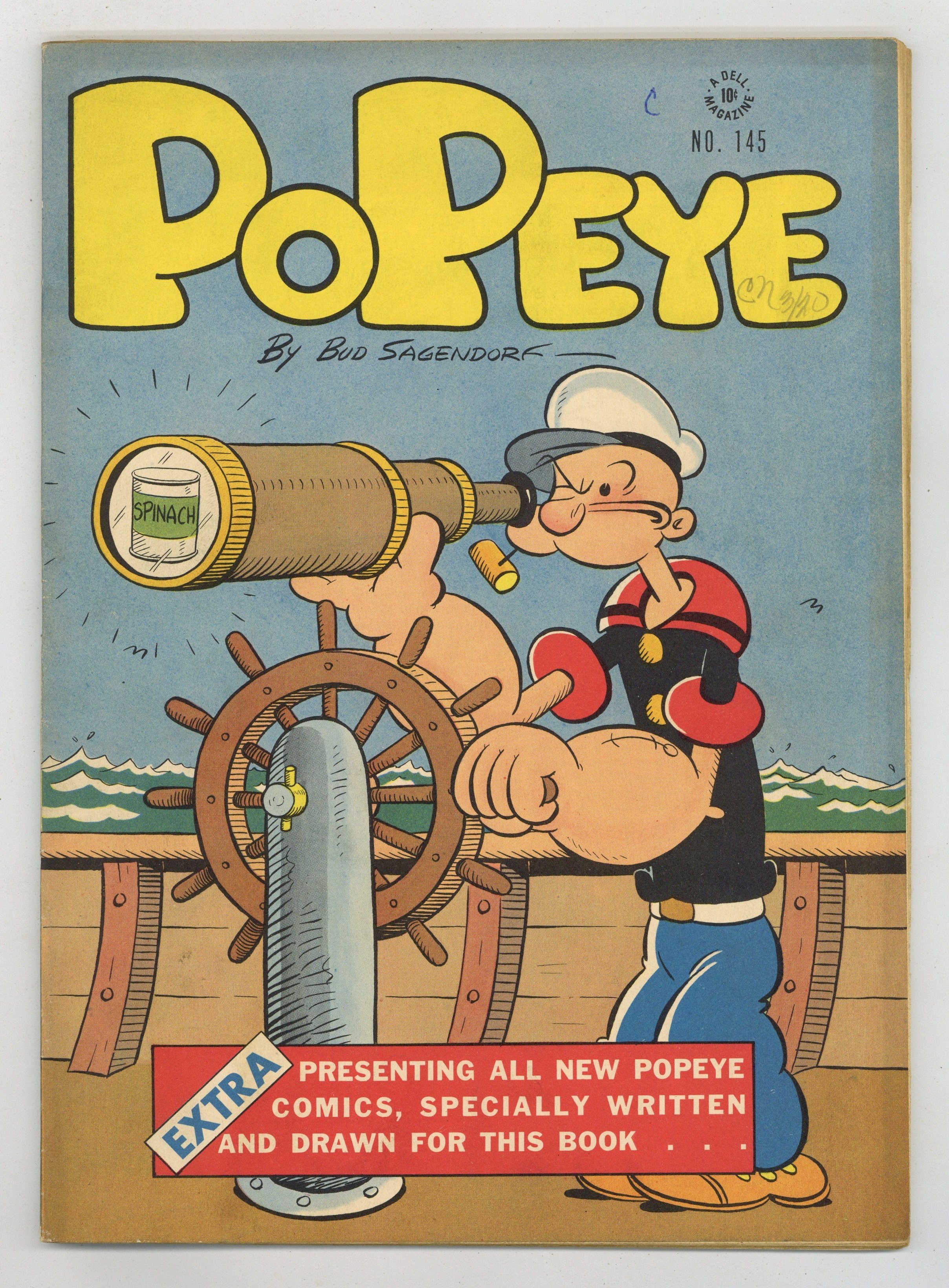 Stories, Art and Cover by Bud Sagendorf. Featuring the tales "Outdoor Boy, or, Please Let Me In the House!" and "Big Blow, or, A Big Wind Is Just a Breeze If Ya Ain't Got a Mast Fer Yer Sail!", plus additional stories on the inside front and inside back covers, as well as the back cover. Starring Popeye! 52 pages, full color. Cover price $0.10.
