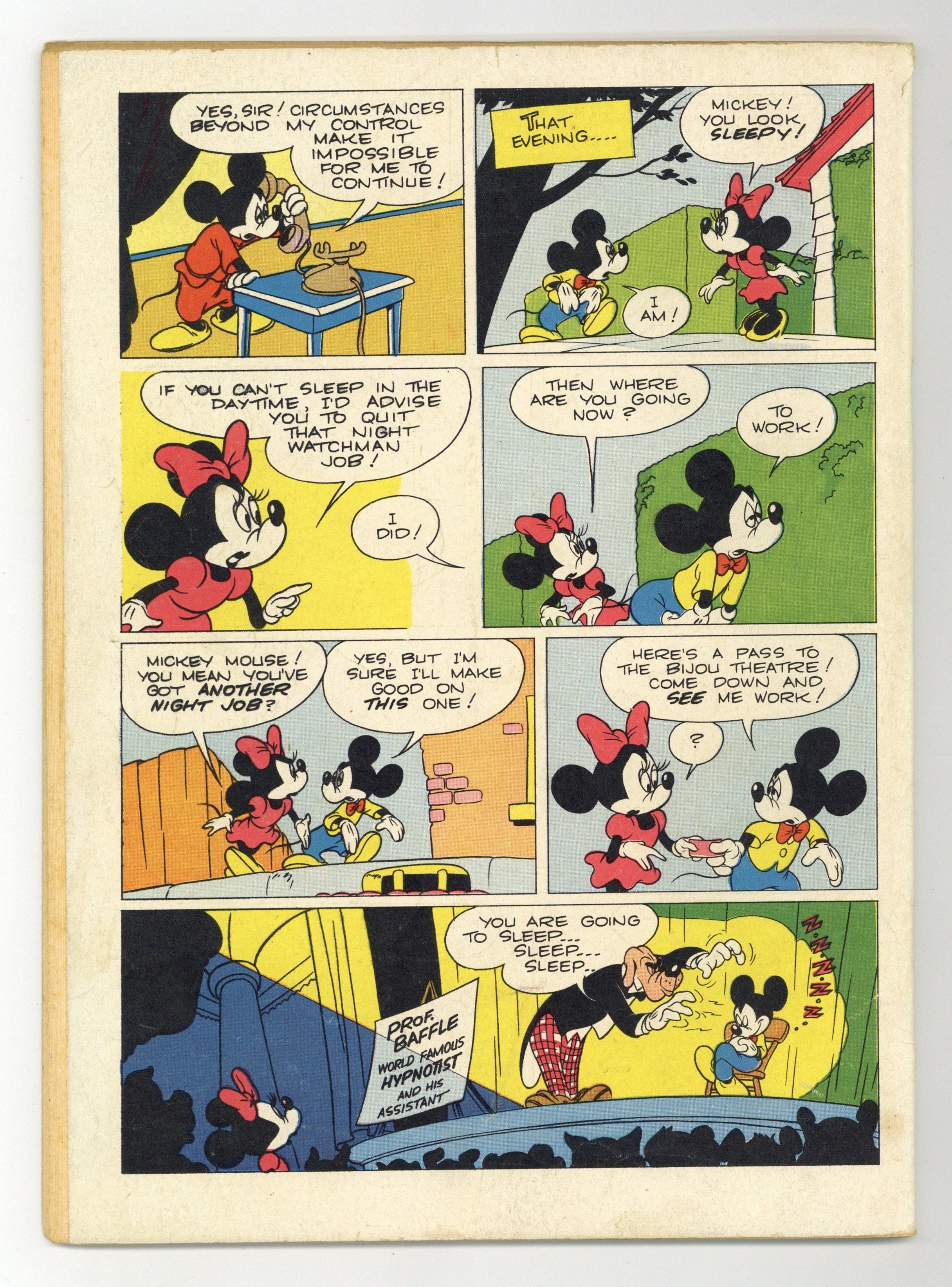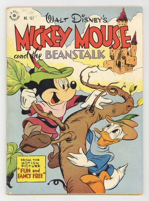 Indicia title is "Walt Disney's MICKEY MOUSE AND THE BEANSTALK, No. 157." Cover art by Don Gunn. Mickey and the Beanstalk, art by Harvey Eisenberg; Famine strikes Happy Valley when the Golden Harp is stolen; After Mickey trades his cow for some magic beans, a giant beanstalk grows into the sky, taking Mickey, Goofy, and Donald's house with it; In the land in the sky, the three go to the giant's castle and rescue the Golden Harp; Adapted from Mickey and the Beanstalk in the animated feature Fun and Fancy Free (1947). Pluto Keeps It Quiet, art by Harvey Eisenberg; Mickey gets a job as a night watchman and Pluto tries to keep the house completely quiet when Mickey sleeps during the day. 52 pages, full color. Cover price $0.10.