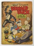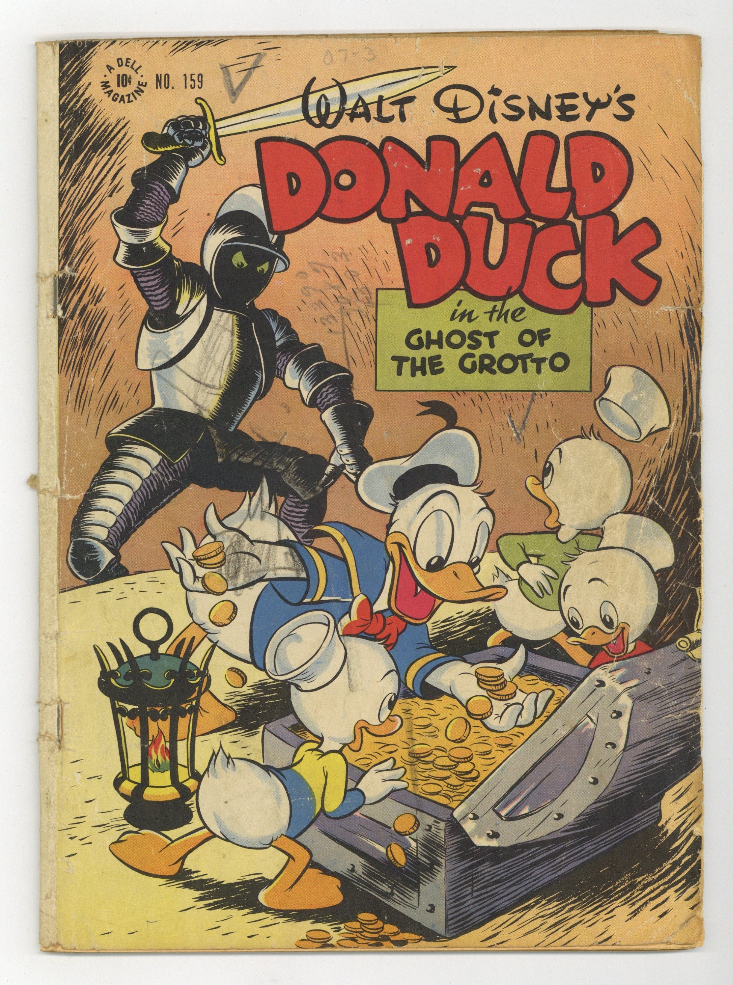 Indicia title is "Walt Disney's DONALD DUCK IN THE GHOST OF THE GROTTO, No. 159." Cover art by Carl Buettner. Donald Duck and the Ghost of the Grotto; While the ducks are running a kelp-gathering boat in the West Indies, they are told of the mystery of an armored man who appears every fifty years to kidnap a small boy; This time, the armored man kidnaps Dewey, and the ducks fight to free him from the armored man's stronghold in a grotto in a coral reef, beneath a rotten old galleon guarded by an enormous octopus. Adventure Down Under; Donald is hypnotized into believing he is a kangaroo and buys airplane tickets to Australia for himself and the nephews; In Australia the ducks try to trap Mournful Mary, the "queen of the kangaroos," and this leads to Donald's falling into the hands of savage aborigines. Scripts and art by Carl Barks. 52 pages, full color. Cover price $0.10.