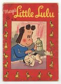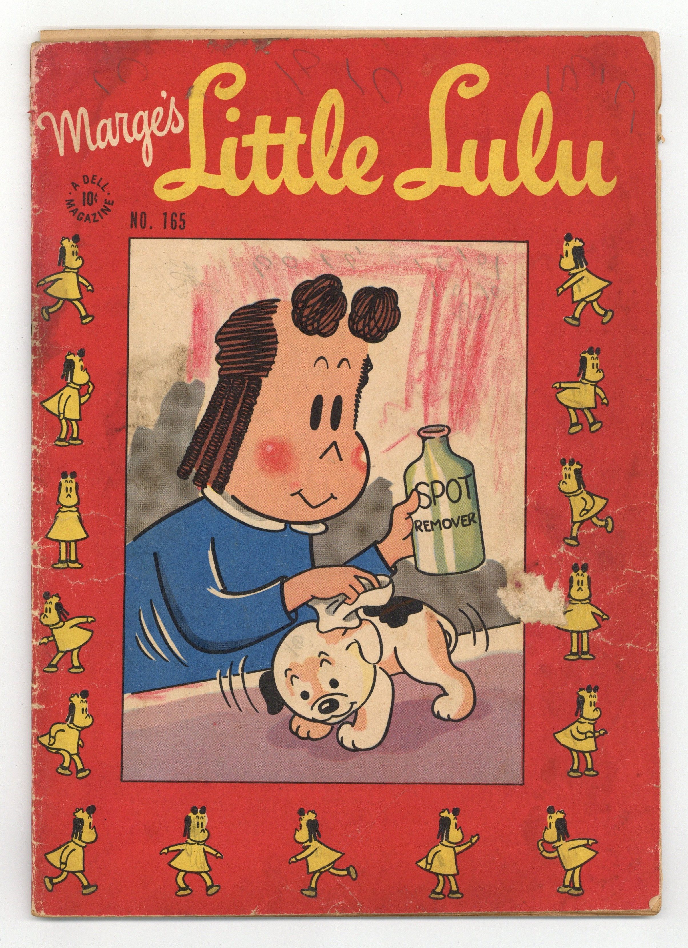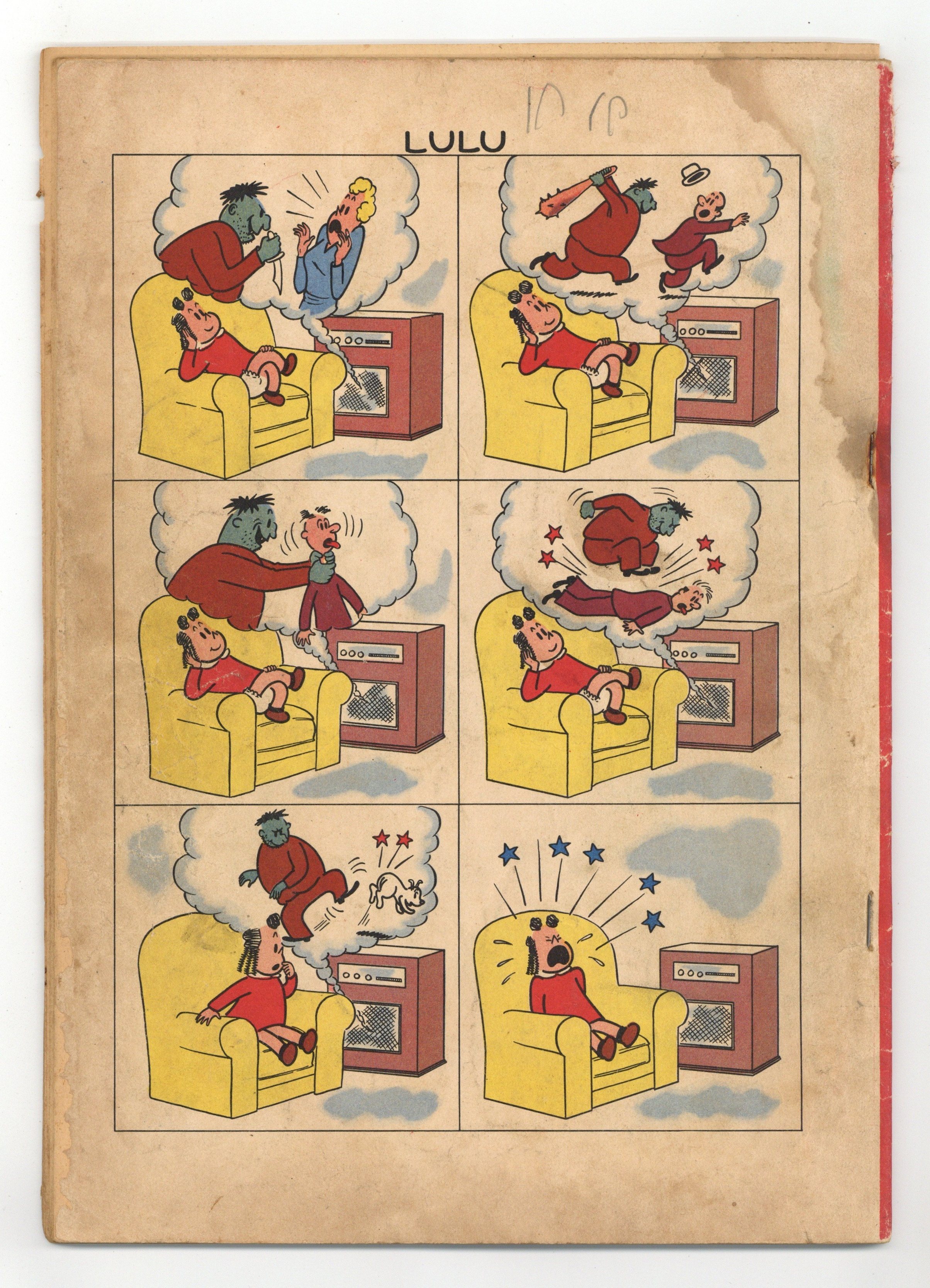 "MARGE'S LITTLE LULU, No. 165." Cover art by John Stanley. Weight and Fortune Machine; Lulu gets a card from a weight and fortune machine. The Case of the Purloined Popover; Lulu is spanked by her mother, who thinks she stole some popovers from the kitchen. Alvin's Solo Flight; Lulu and Tubby go to the beach, but have to take Alvin along with them. Never Again; Lulu borrows her father's pipe, smokes some doll hair, and has hallucinations. Scripts and art by John Stanley. 52 pages, full color. Cover price $0.10.