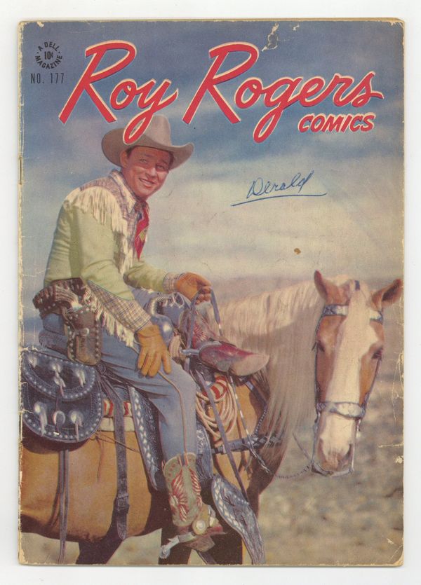 Indicia title is "ROY ROGERS COMICS, No. 177." Roy Rogers and original Trigger photo cover. Candid-like photo, taken on filming location ("On the Old Spanish Trail", identified in caption), featuring Roy with owl on inside front cover. Roy Rogers and the Wolves of the Little Moab, script by Gaylord Du Bois, art by Harry Parkhurst [as Harry Parks]; Roy helps Sheriff Bill Prime, an old friend, solve a murder and cattle-rustling committed by the "Wolves of the Little Moab" gang (so-called because they wear wolf's head masks). Captioned, candid-like photo featuring Roy on movie location, cleaning rifle, on inside back cover. Roy Rogers and original Trigger back cover photo. 36 pages, full color. Cover price $0.10.