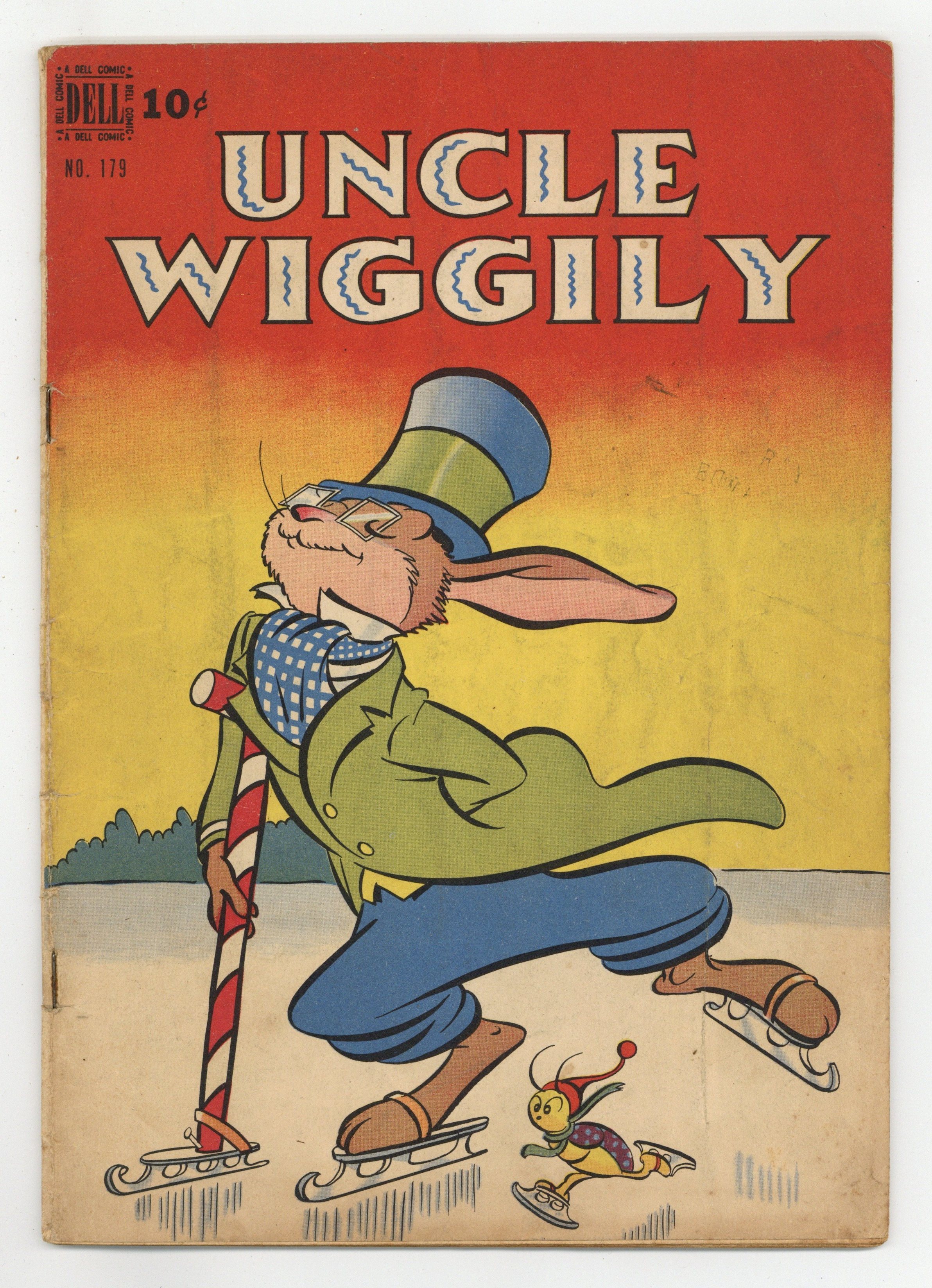 Indicia title is "UNCLE WIGGILY, No. 179. Cover art by Walt Kelly. Uncle Wiggily's Flying Shoes, script by Roger Garis, art by H. R. McBride; Uncle Wiggily finds that he can bound high in the air with the aid of air-filled rubber pillows on his feet and guide himself with his umbrella; After Uncle Wiggily foils Skeezicks' attempt to steal a bird's nest; Skeezicks and his pal Pip plot to get revenge. Homemade Skeeter Dope, script by Roger Garis, art by H. R. McBride; Uncle Wiggily mixes up a batch of mosquito repellent, but it attracts mosquitoes rather than repels them. Uncle Wiggily Buries His Fortune, script by Gaylord Du Bois, art by H. R. McBride; Uncle Wiggily digs a hole deep under a tree to bury his fortune. 36 pages, full color. Cover price $0.10.