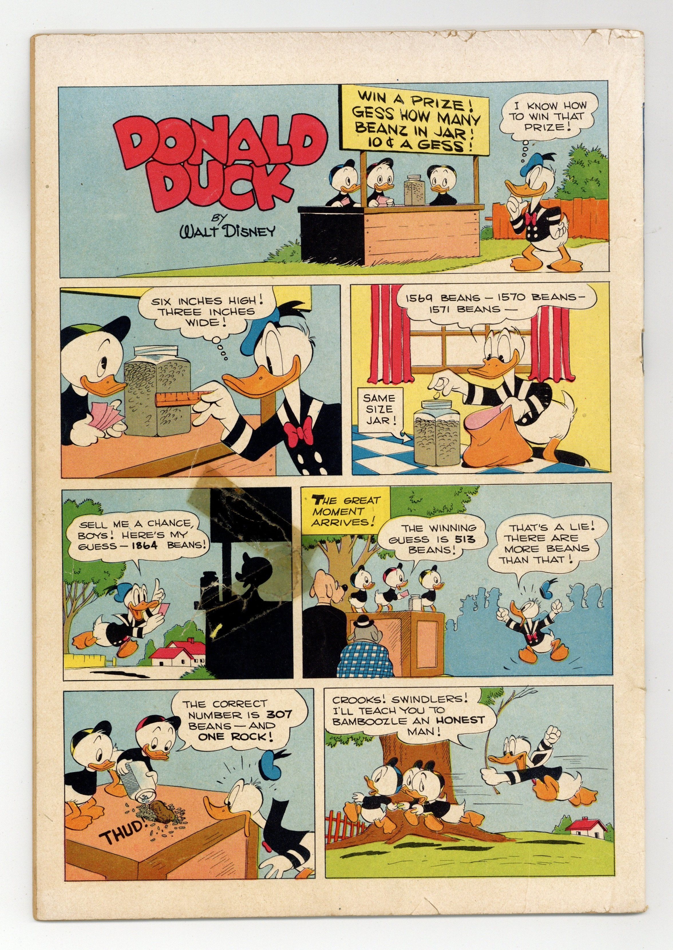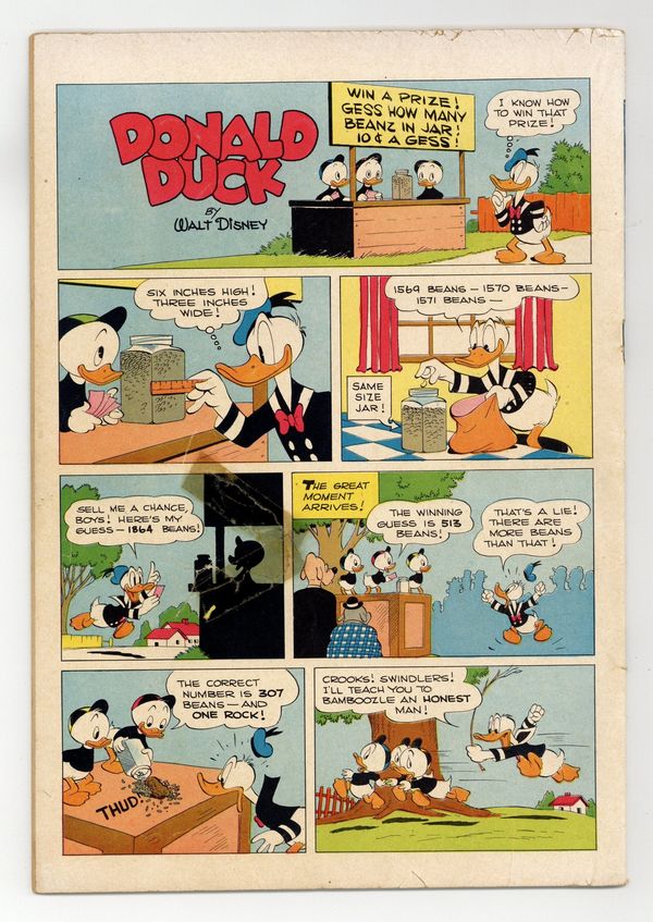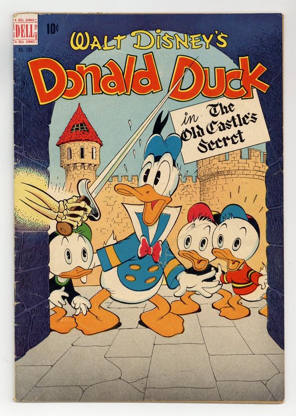Indicia title is "Walt Disney's DONALD DUCK IN THE OLD CASTLE'S SECRET, No. 189." Cover art by Carl Barks. The Old Castle's Secret, script and art by Carl Barks; Uncle Scrooge and the ducks go to Scotland to find the treasure hidden in the walls of the old McDuck castle, and there they encounter a "ghost" that is invisible except for the shadow cast by its skeleton; The "ghost" soon steals the treasure and traps the ducks on a balcony a hundred feet above the ground, but the nephews get down safely and find a secret entrance to the castle through an old graveyard. Horseshoe Luck, script and art by Carl Barks; Donald refuses to believe that finding a horseshoe brings good luck. Bean Taken back cover strip by Carl Barks; Donald devises a system for guessing the number of beans in a jar. 36 pages, full color. Cover price $0.10.