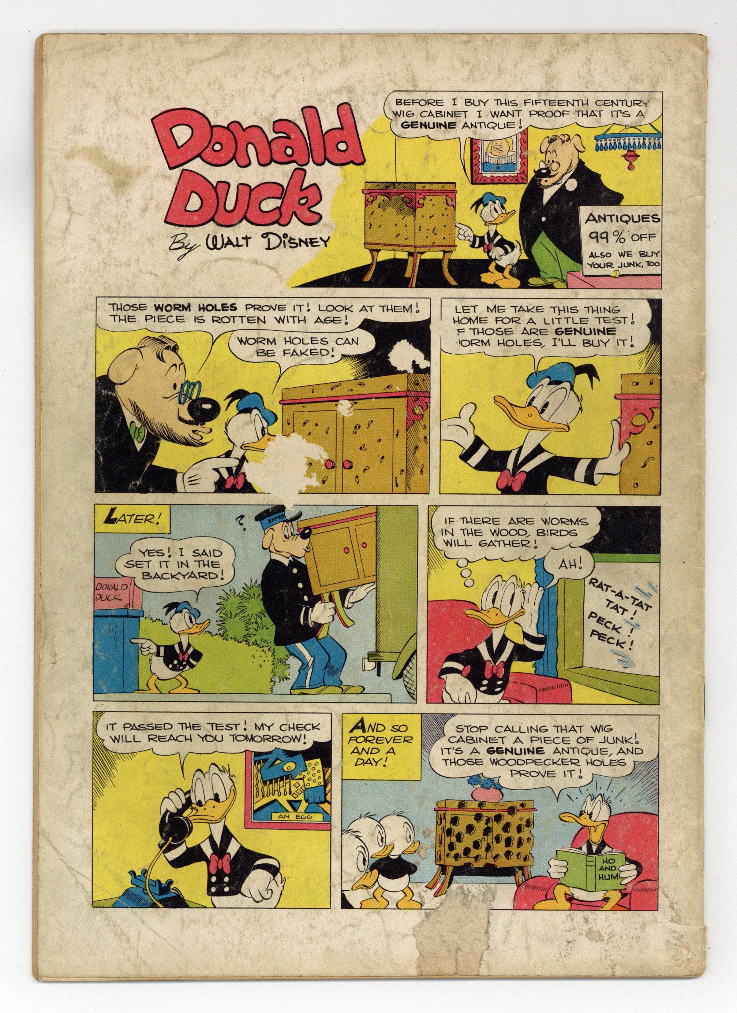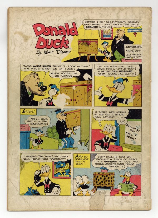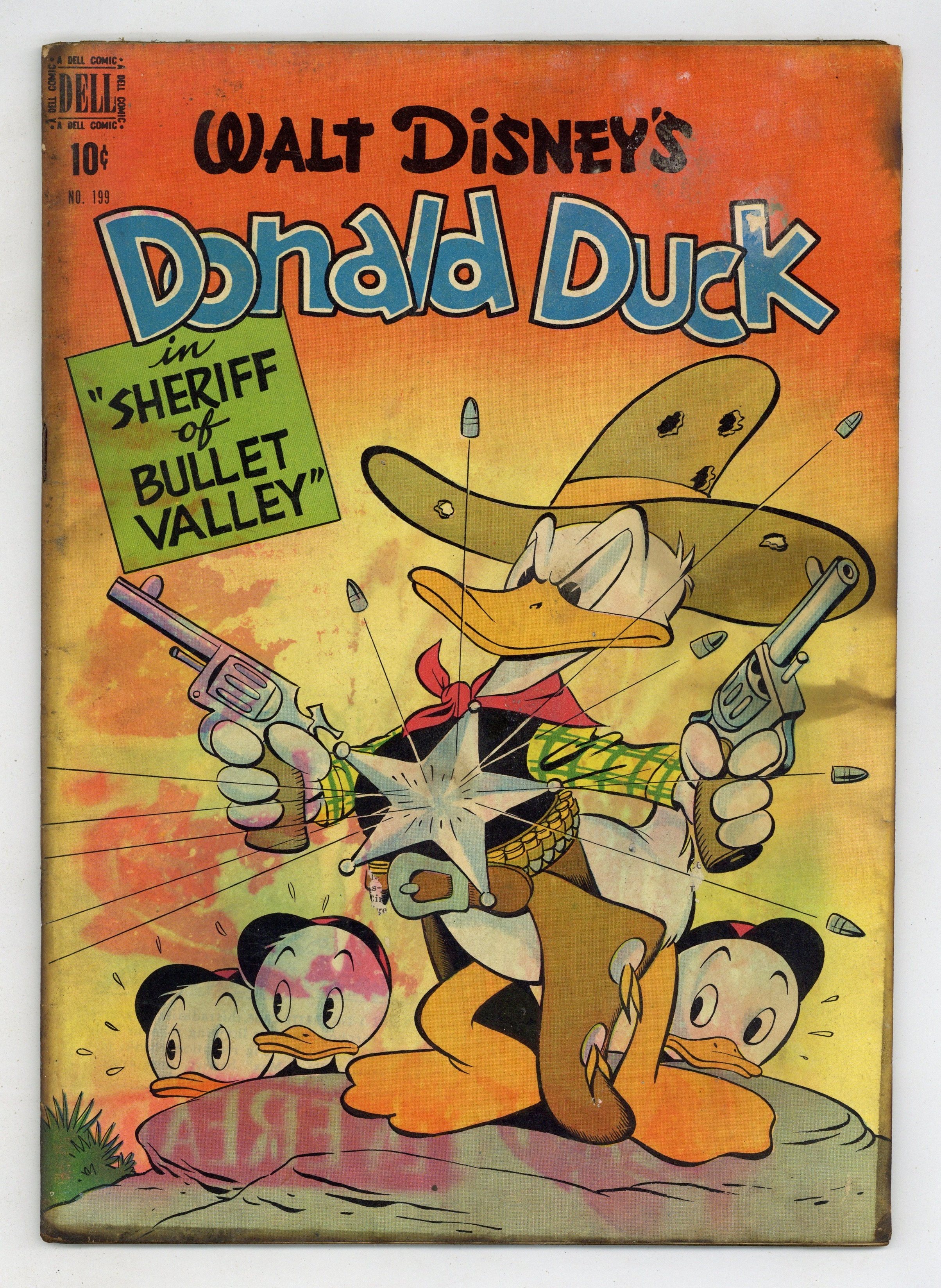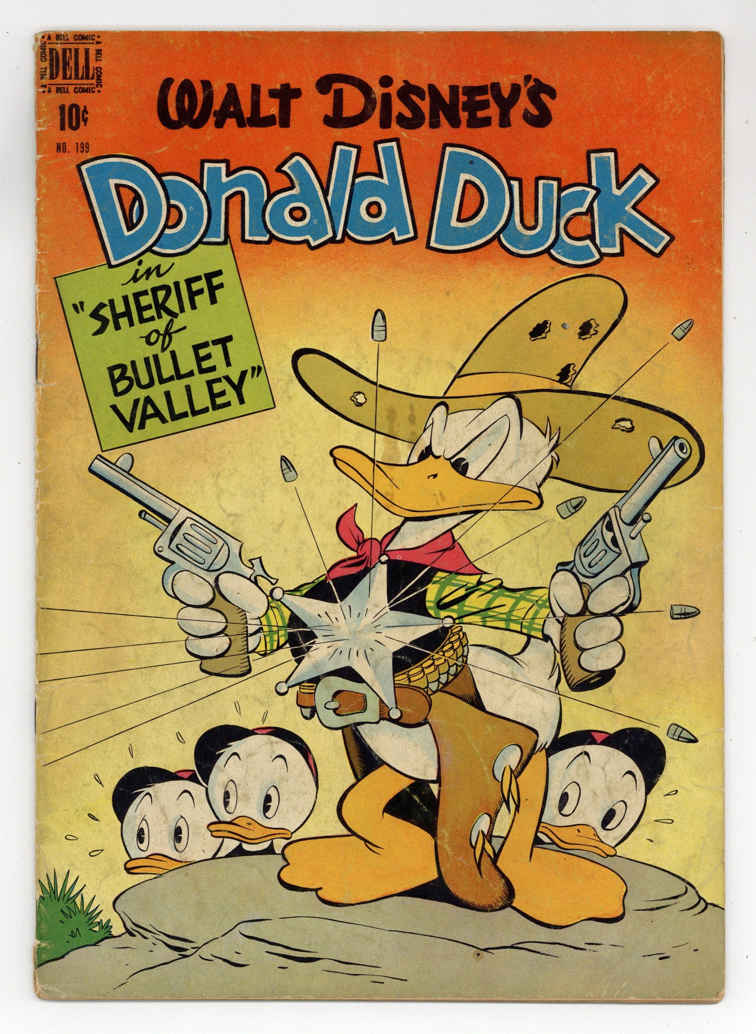 Indicia title is Walt Disney's DONALD DUCK in SHERIFF OF BULLET VALLEY, No. 199. Cover art by Carl Barks. Sheriff of Bullet Valley, script and art by Carl Barks; Donald becomes a sheriff's deputy in Bullet Valley and is sent out to bring in a gang of rustlers; The rustlers are led by Blacksnake McQuirt, a tough gunman who poses as a legitimate rancher and uses a branding ray to change brands from as far as a mile away. Best Laid Plans inside back cover strip by Carl Barks. The Genuine Article back cover strip by Carl Barks; Donald tests the authenticity of worm holes in an antique. 36 pages, full color. Cover price $0.10.