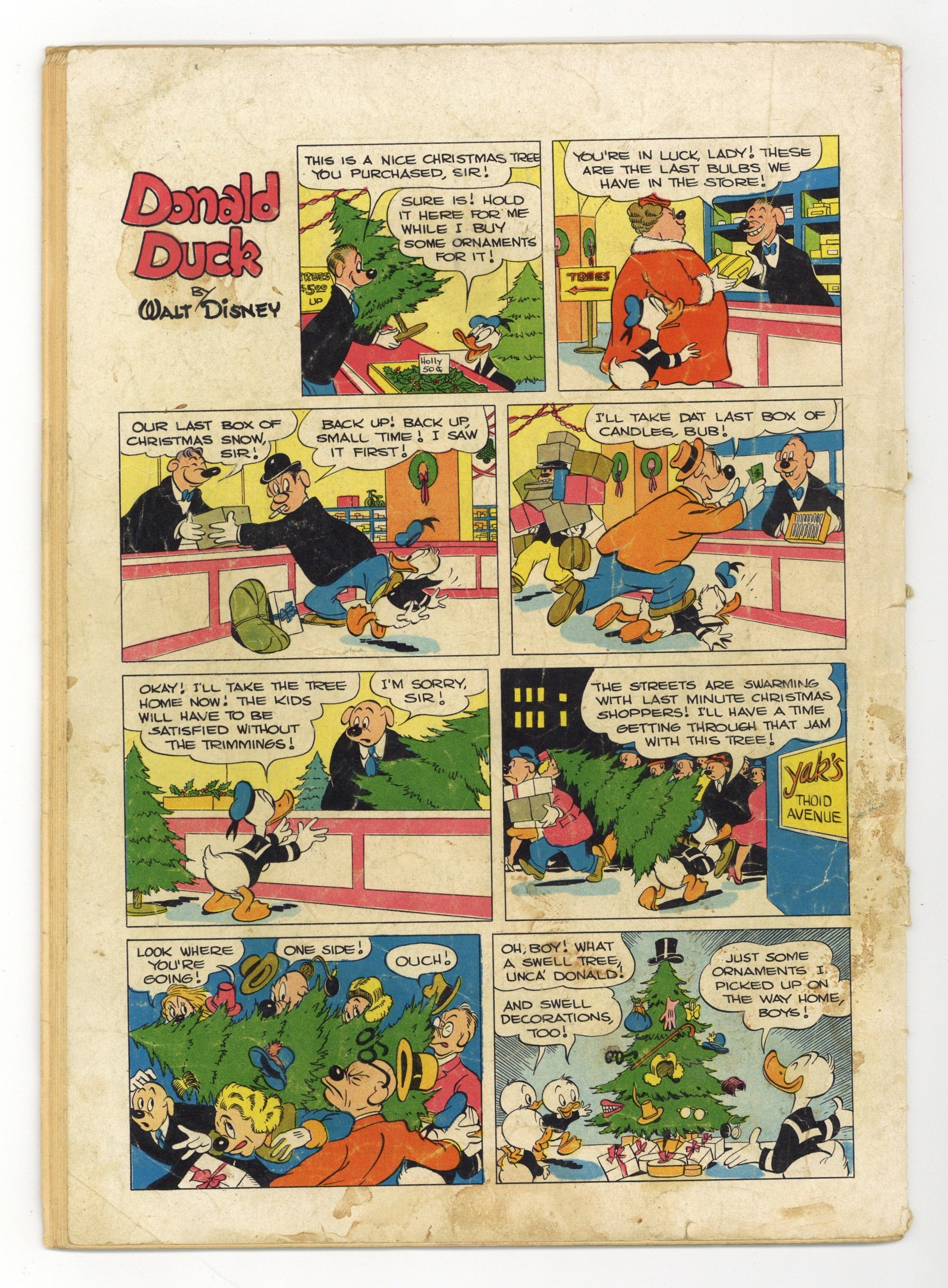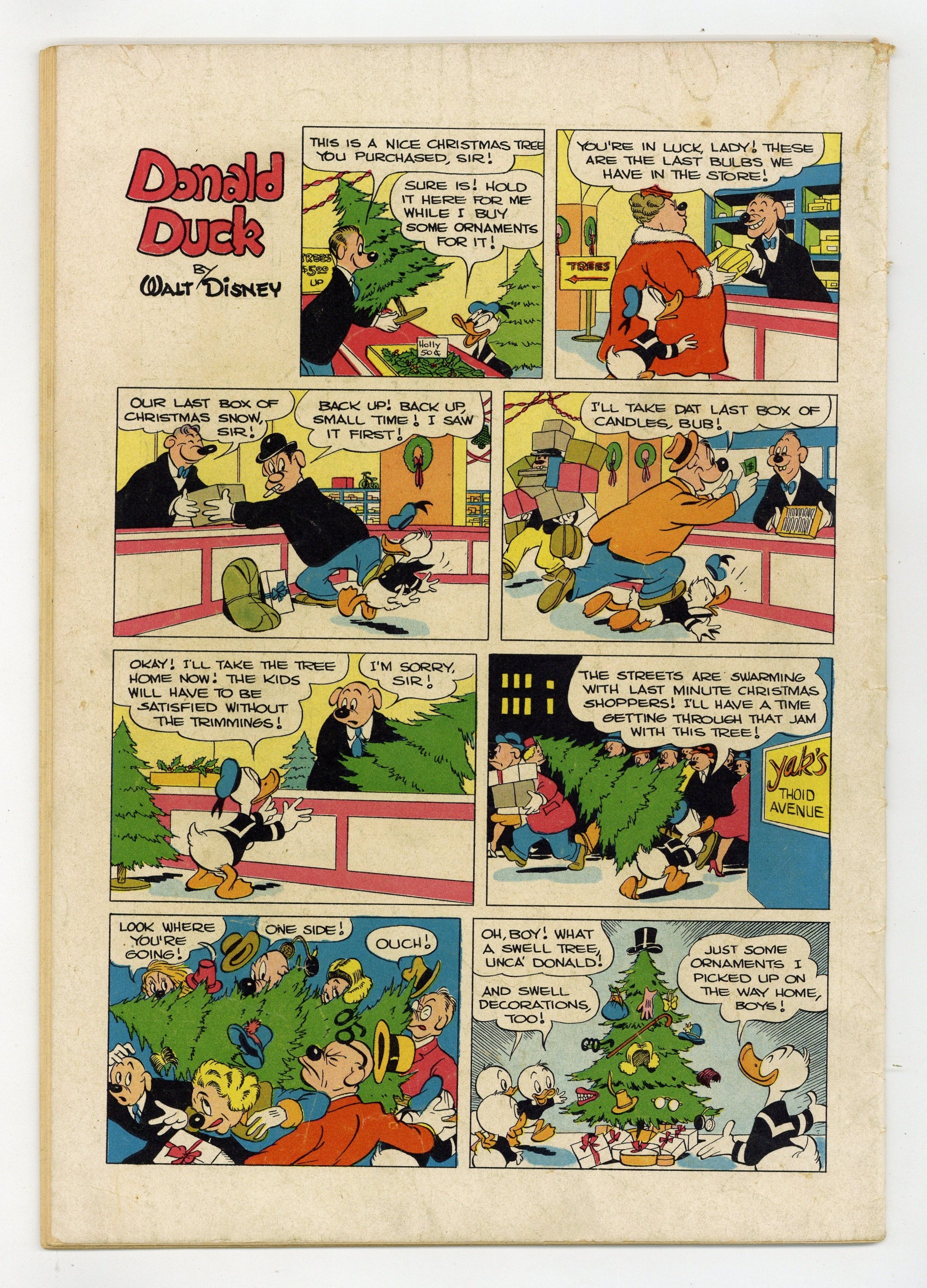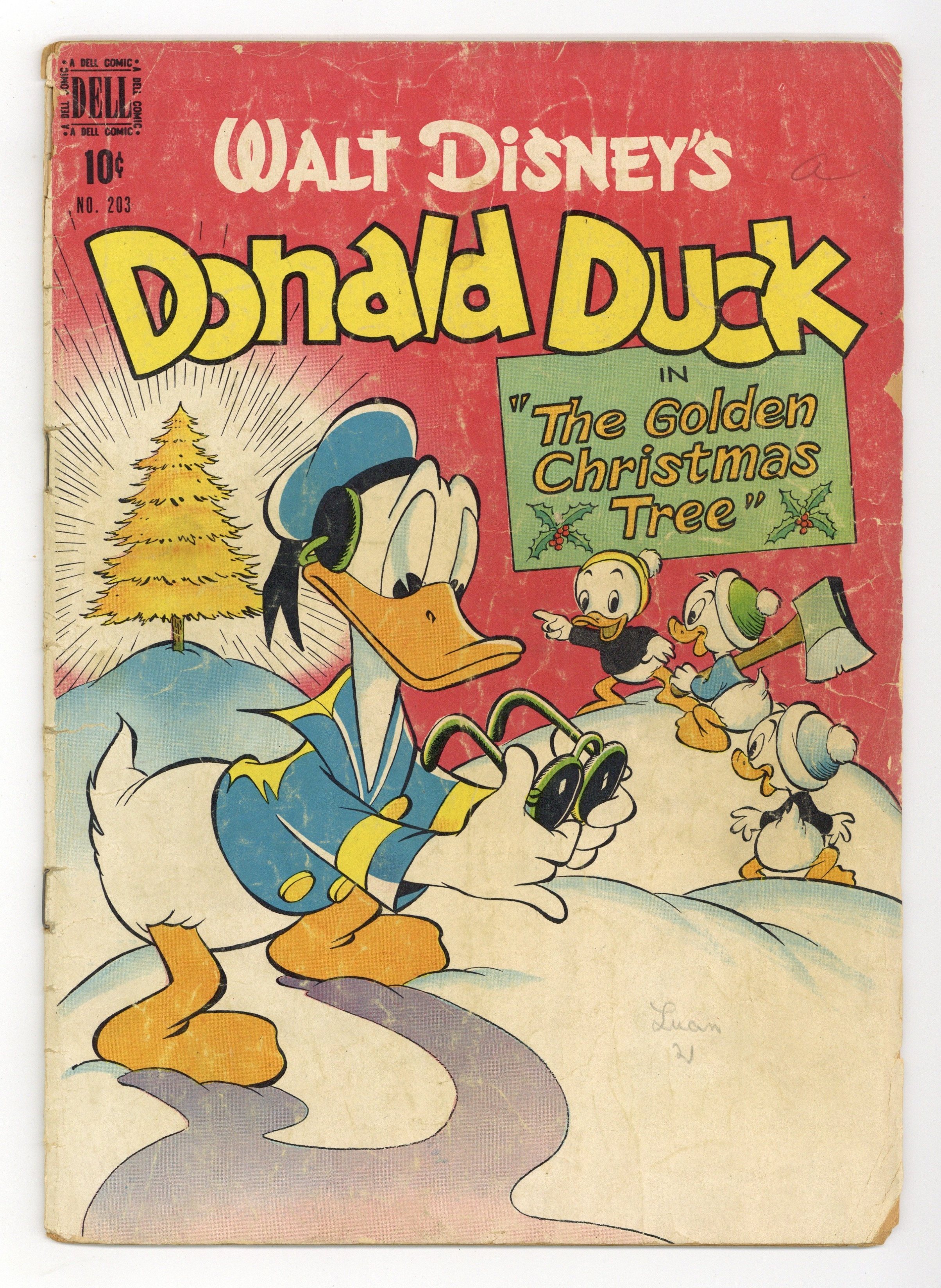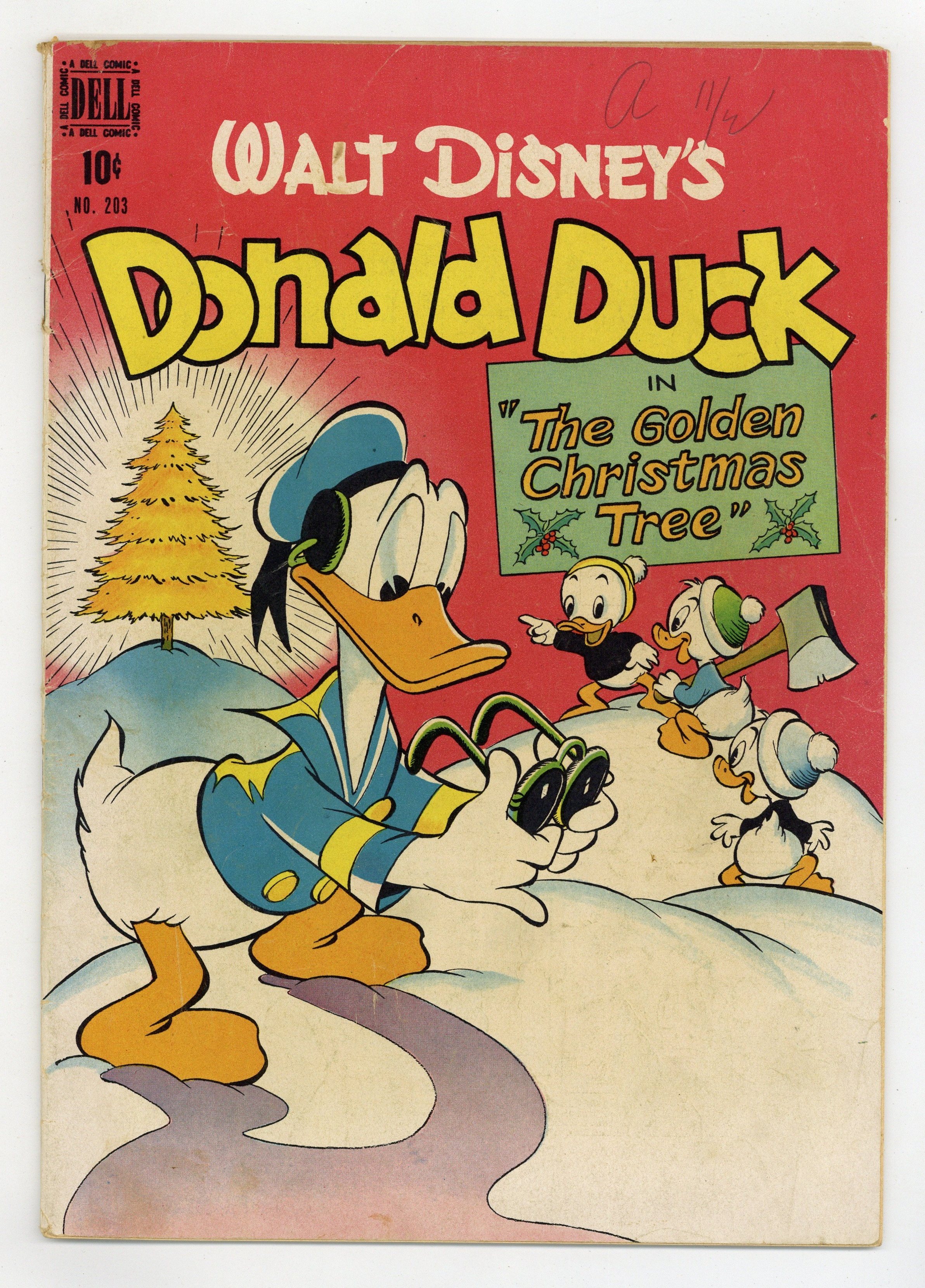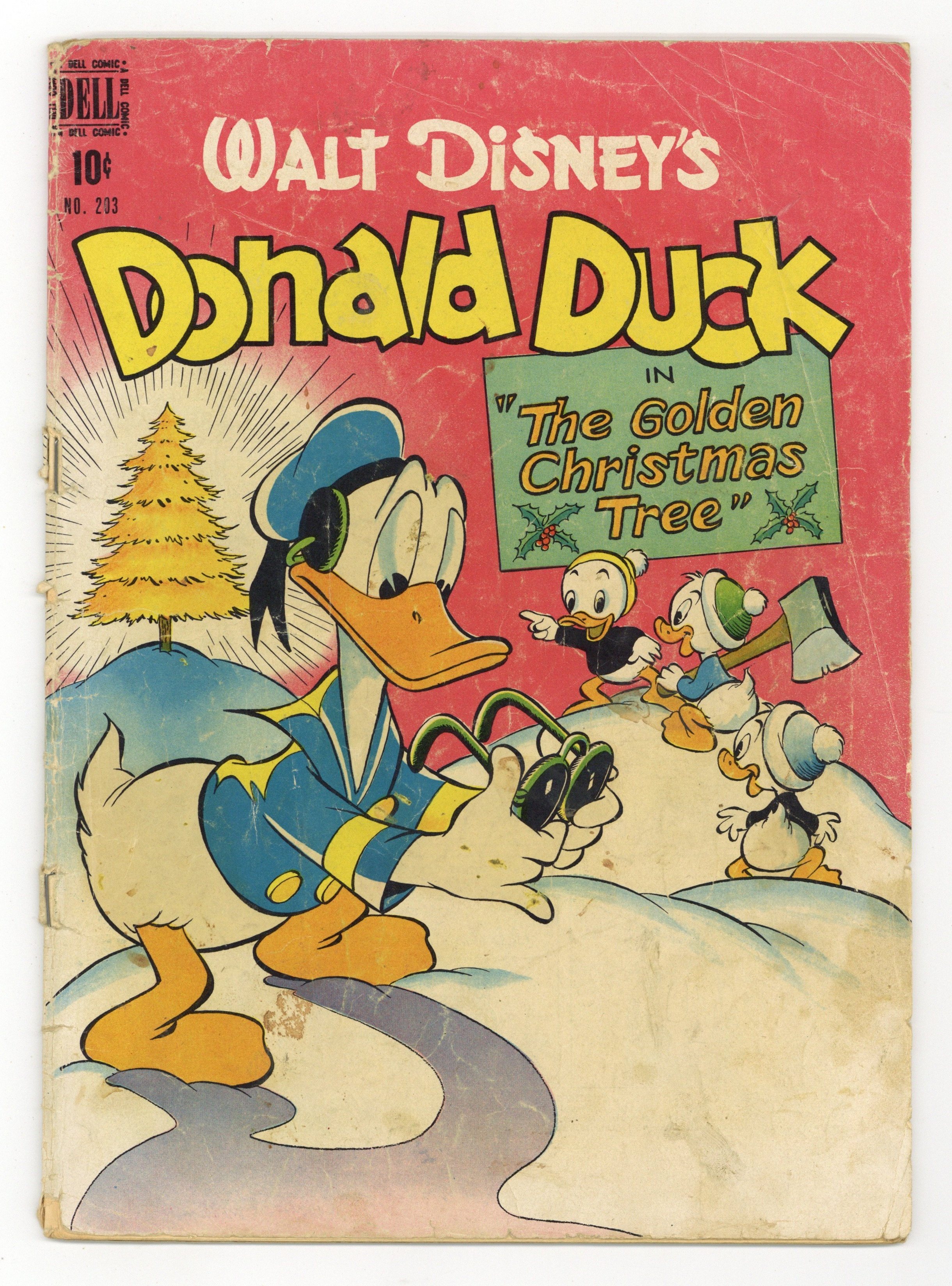 Indicia title is Walt Disney's DONALD DUCK in THE GOLDEN CHRISTMAS TREE, No. 203. The Golden Christmas Tree, art by Carl Barks; The nephews, disappointed in their wish for a golden Christmas tree, are lured into a trap by a witch who plans to use their tears in a magic potion that will destroy all the Christmas trees on earth. Special Delivery, script and art by Bill Wright; Santa sprains his ankle when he visits Mickey's house on Christmas Eve; Mickey and Goofy deliver the presents on the few remaining stops on Santa's list, but not without a number of accidents. The True Test one-page strip, script and art by Carl Barks; Donald tests toys to see how sturdy they are. Ornaments on the Way one-page strip, script and art by Carl Barks. 36 pages, full color. Cover price $0.10.