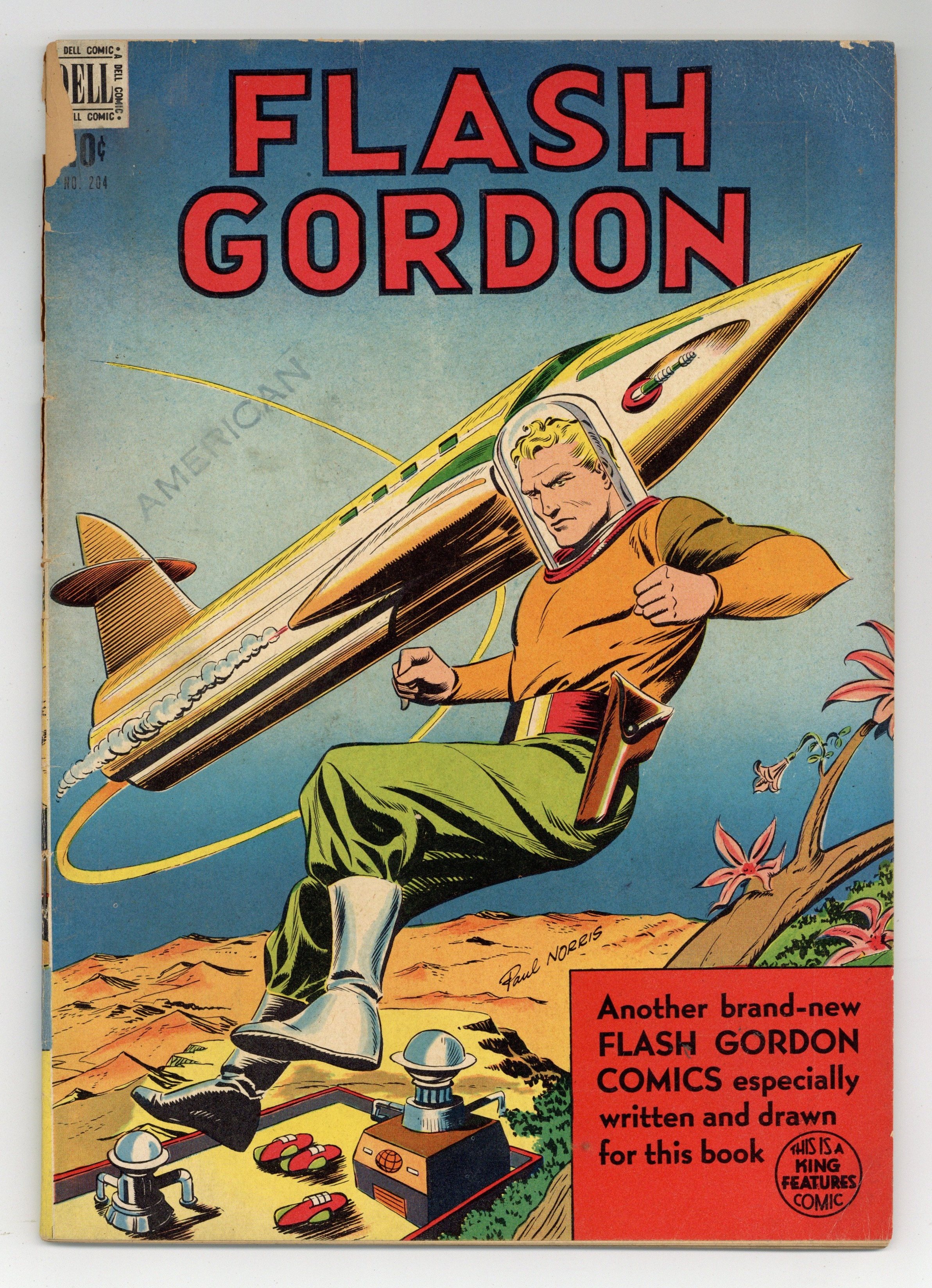 Indicia title is "FLASH GORDON, No. 204." Cover art by Paul Norris. Flash Gordon Cut-Out Jet-Car activity page. Adventure on Orano, script and art by Paul Norris; Two modified V-2 missiles take off from Earth, one crash-lands on Mongo, the other on the planet Orano; Flash finds the ship that crashed on Mongo has an American crew; The other ship is a mystery; Flash and the Americans go to Orano to investigate, but are captured by the forces of Orano's cruel ruler, Torro, the Terrible. Orano Fly Model Space-Ship activity page. Fight at Space Port back cover art by Paul Norris. 52 pages, full color. Cover price $0.10.