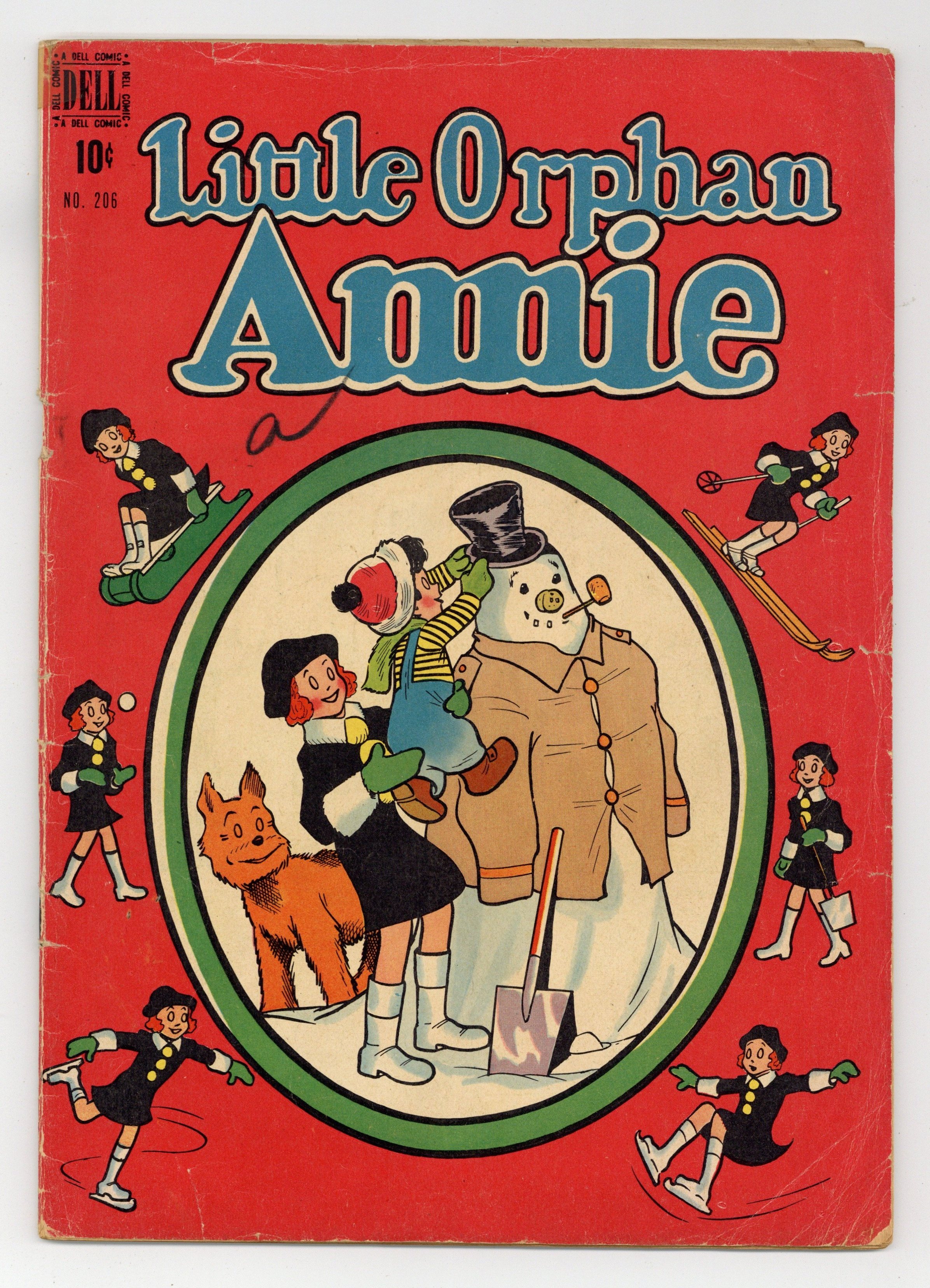 Indicia title is LITTLE ORPHAN ANNIE, No. 206. The Battle for Peg's Son, Billy, script and art by Harold Gray; Peg becomes a successful dress designer; Her former husband, band leader and movie star Peter La Plata (Bill Slagg), tries to take their son away from his parents, who are raising the boy in the boarding house where Peg and Annie are staying; (Not knowing that the boy is Peg's son); Failing in his attempt to get his parents to give him the boy, La Plata breaks his wrist while taking a swing at Sam the tailor, which sets a series of events in motion that leads to his downfall. Reprinted from Little Orphan Annie (News Syndicate Co.) newspaper strips from 1940. 36 pages, full color. Cover price $0.10.