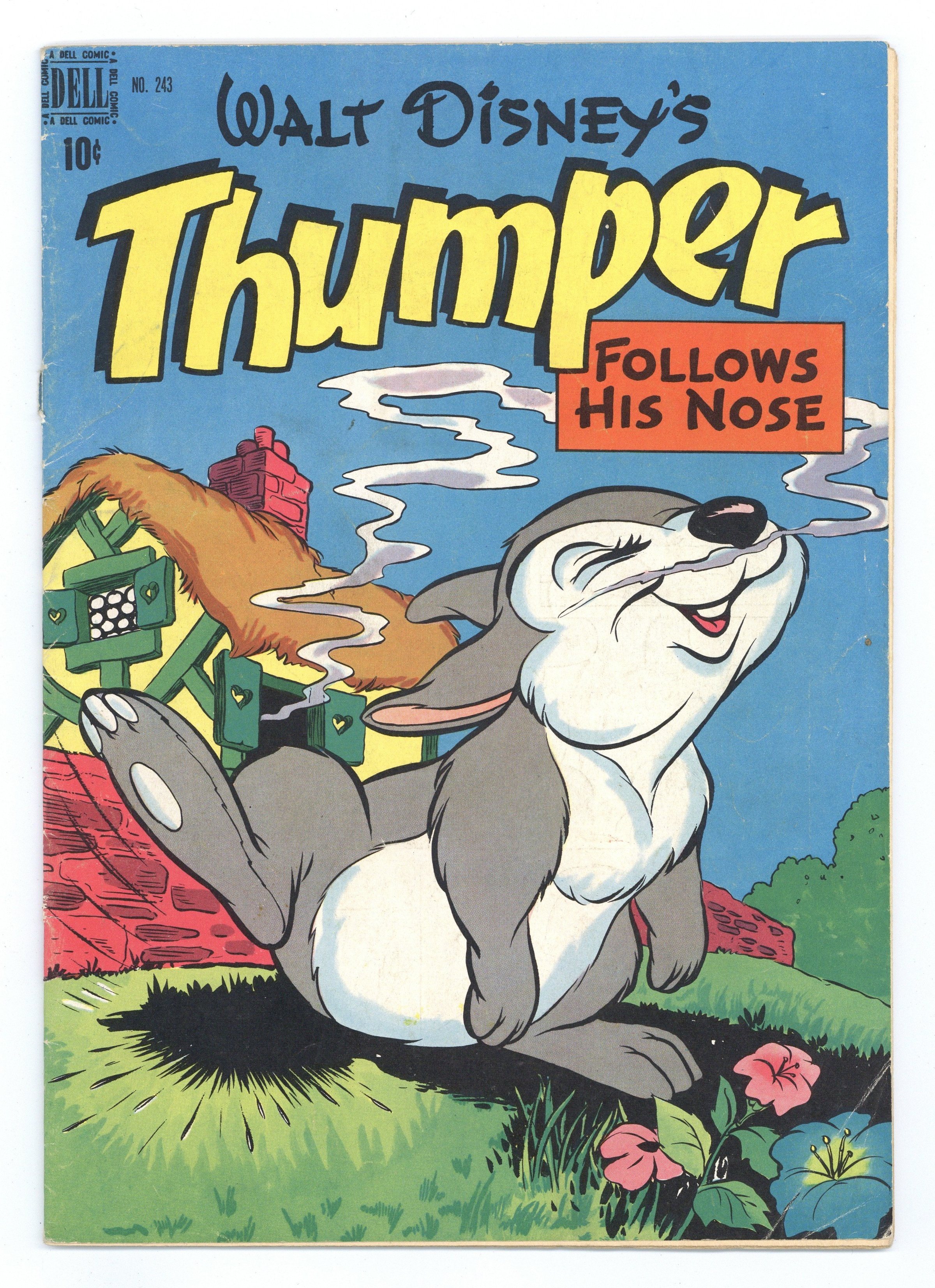 Indicia title is "Walt Disney's THUMPER FOLLOWS his NOSE, No. 243." Cover art by Carl Buettner. Thumper Follows His Nose, art by Jim Pabian; Thumper finds the Three Bears' house and tussles with his conscience about eating the porridge; He leaves the house but runs into the Big Bad Wolf. The Li'l Giant, art by Tony Strobl; Thumper is depressed when he's told he's just a little bunny; Later he learns that size is relative, when he meets Wiggly Worm, to whom Thumper is a giant. Thumper Is a Hero, art by Tony Strobl; When lumbermen and hunters threaten the forest, Thumper decides he has to do something; He puts out a fire left by careless hunters and as a reward the forest rangers declare the area a forest preserve. 36 pages, full color. Cover price $0.10.