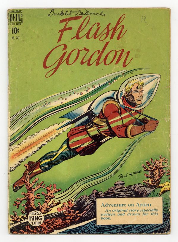 Indicia title is "FLASH GORDON, No. 247." Cover art by Paul Norris. Notes on the Operation of a Mongo Space Ship. Adventure on Artico, art by Paul Norris; King Zero of the planet Artico is using a climate-changing ray to cause snow to fall continuously on Mongo, disrupting and threatening life on the planet; Flash leads an attack on the ice planet Artico, but is captured and put to work under the sea harvesting seaweed; Dale has stowed away in Flash's ship and is also captured, but she is kept in the King's castle because the King is infatuated with her. Comparison of Earth vehicles with the Mongo equivalents. Blueprint of a scale model space ship, with dimensions superimposed over photos of a three-dimensional model on the back cover. 36 pages, full color. Cover price $0.10.