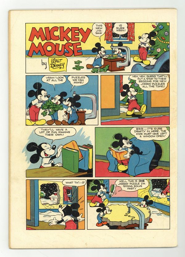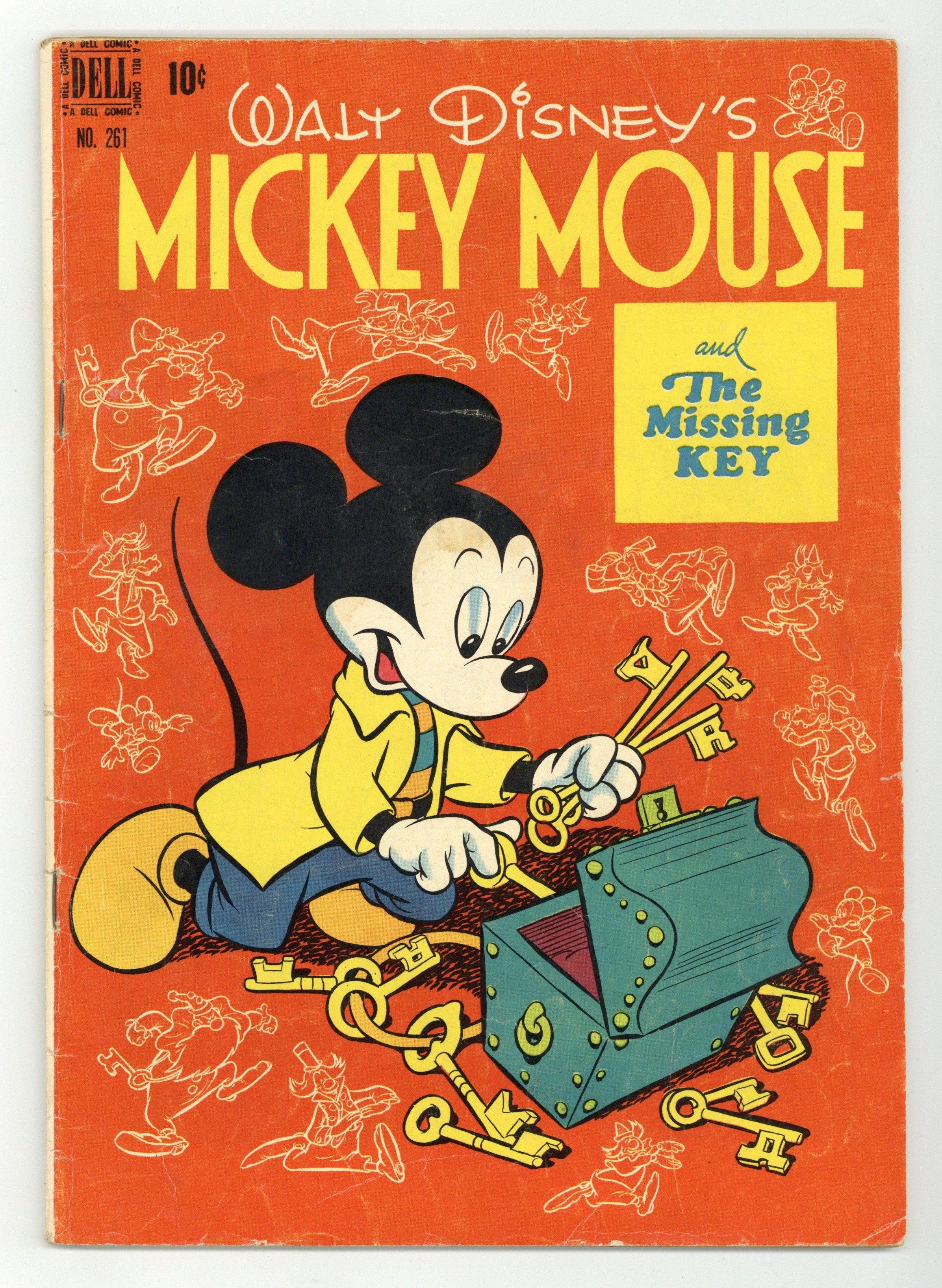 $35.50Indicia title is "Walt Disney's MICKEY MOUSE and the MISSING KEY, No. 261." Cover art by Paul Murry. Mickey Mouse and The Missing Key, art by Jim Pabian; Two clowns deliver a steel trunk to Goofy, an inheritance from his Uncle Clown Goof; However they didn't leave a key to the trunk, so Mickey and Goofy travel to Clownland to retrieve the key. Mickey Mouse and the Phantom Thief, script and art by Bill Wright; Chief O'Hara comes to Mickey's house late at night to request his help because a string of burglaries has been committed. 52 pages, full color. Cover price $0.10.