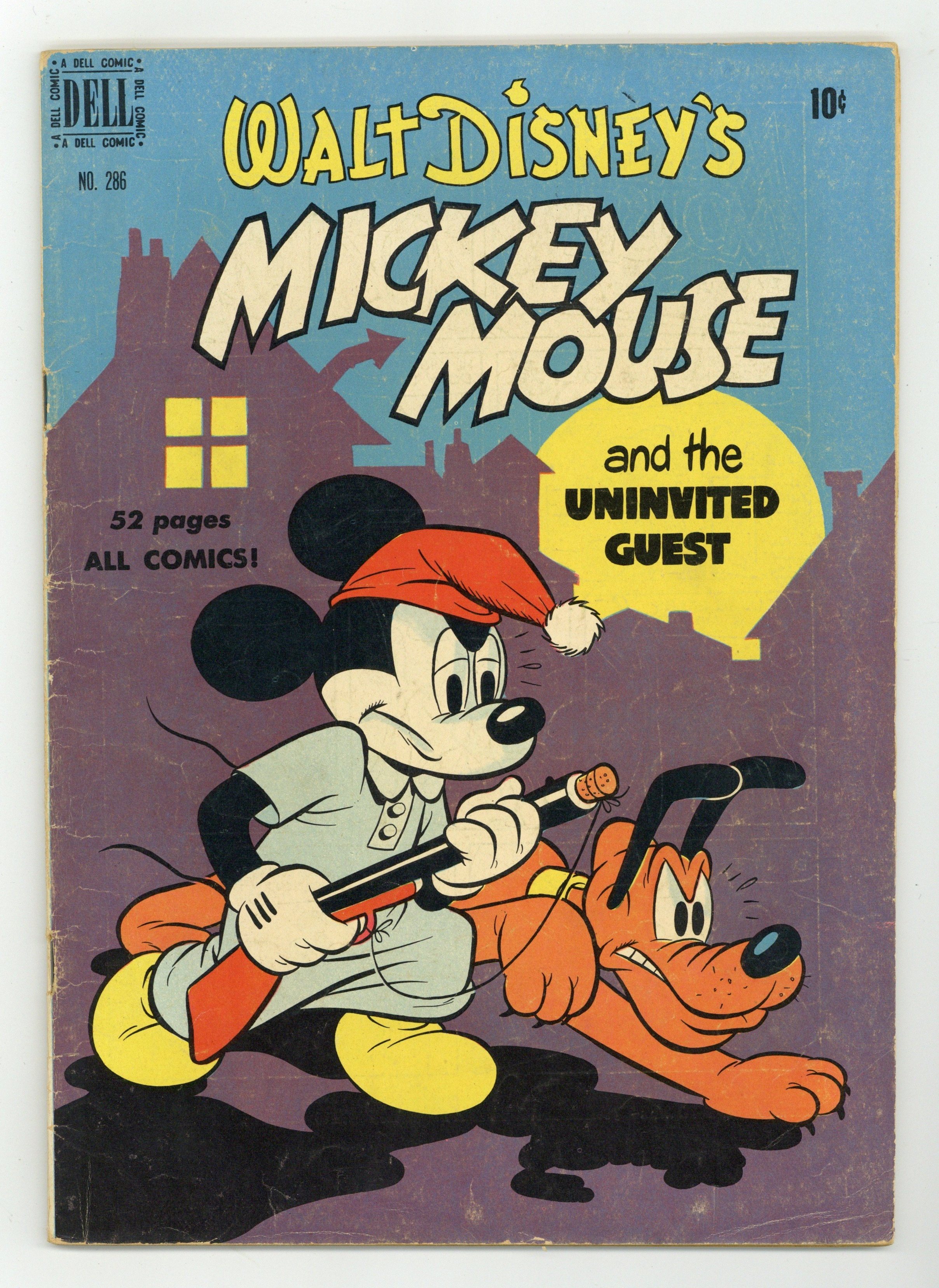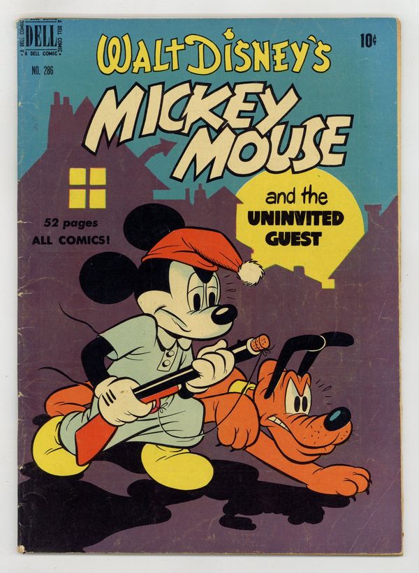 Indicia title is "Walt Disney's MICKEY MOUSE in "THE UNINVITED GUEST," No. 286." Cover art by Bill Wright. The Uninvited Guest, pencils by Riley Thompson; Mickey and the nephews are vacationing at the beach when a seal takes over their bathtub; The seal causes Mickey all sorts of problems; Mickey is kidnapped by a bank robber named Big Duke. Feat of Fancy, art by Tony Strobl; Mickey falls asleep during a chess match with Goofy and dreams he is a knight who has to defeat a dragon to win the hand of the fair Princess Minnie. Hot Day back cover strip, art by Bill Wright. 52 pages, full color. Cover price $0.10.