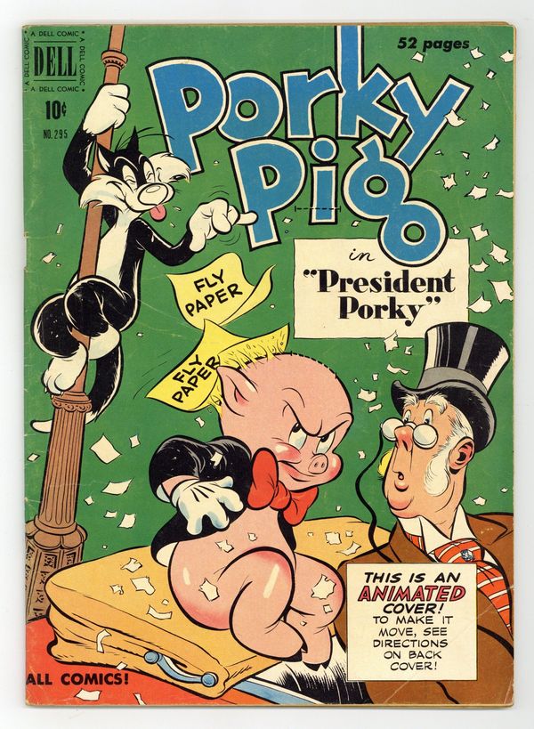 Indicia title is "PORKY PIG in PRESIDENT PORKY, No. 295." Cover pencils by Ralph Heimdahl. President Porky, pencils by Fred Abranz; Porky is chosen to be the President of the tiny Kingdom of Upper Gorgonzola; He is threatened by The Dunderbunk, a group who want to restore the old monarchy of King Schmaltz. Second Sight, art by John Carey; In Chinatown, Porky buys a jar of perfume supposedly used by Chinese Mandarins; He takes a whiff of the perfume and temporarily acquires "second sight," the ability to find anything that's lost or hidden. The New Swimming Hole, art by Jack Bradbury; Porky and Bugs run into all sorts of problems when they try to dig a swimming pool in Porky's yard. 52 pages, full color. Cover price $0.10.