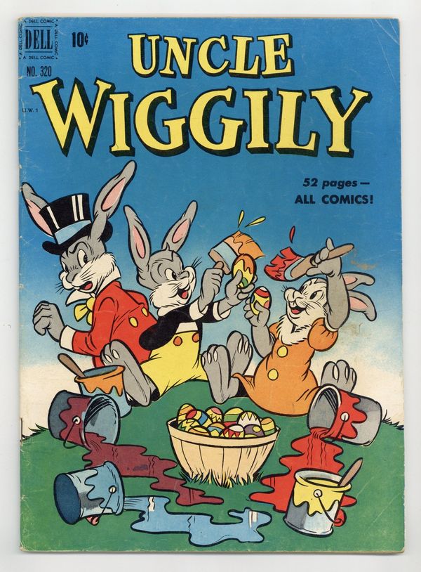 $15.99Indicia title is "UNCLE WIGGILY, No. 320." Cover art by Dan Gormley. The Woodland Skating Contest; When Mr. Whitewash, the polar bear, comes to visit Wiggily, he agrees to be Bunty's partner in the ice skating contest. The Ski-Skimmer; Wiggily converts his automobile into a ski-skimmer; but forgets to invent some brakes.; After a hair-raising ride with Uncle Butter, the two manage to get the vehicle back home. Grandpa Chuck, the Weather Forecaster; Wiggily tries to get Grandpa Chuck, the weather forecaster, to use more modern methods for predicting the weather. Wooden Easter Eggs; Wiggily sends Sammy and Possie to the store to get some eggs to color for Easter. Woodland Music Festival; Shaggy Wolf tries to learn to play the clarinet so he can join Wiggily's band at the Woodland Music Festival. Scripts by Roger Garis, art by Francis Kirn. Reprinted from Uncle Wiggily (Bell Syndicate) 1947-1949 Sunday newspaper strips. 52 pages, full color. Cover price $0.10.
