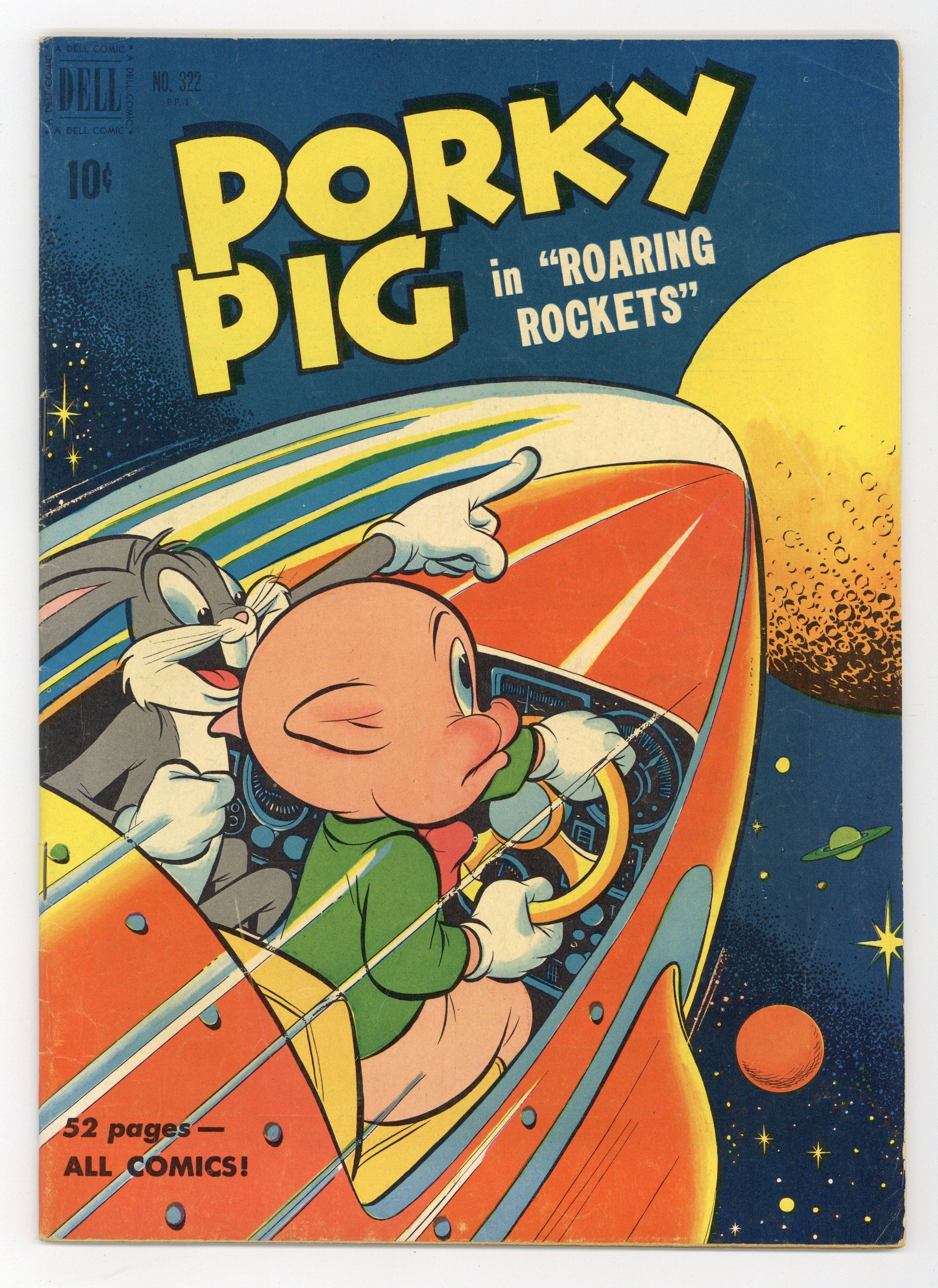 Indicia title is "PORKY PIG in ROARING ROCKETS, No. 322." Cover pencils by Ralph Heimdahl. Roaring Rockets, art by John Carey; Porky, Petunia, and Cicero go to an exhibit of wooden space ship models, where Bugs is the guard and guide. Porky Pig at the County Fair, art by Fred Abranz; Porky and Bugs are supposed to take Petunia's cake to a contest at the county fair; Porky leaves the cake with Bugs while he goes to see Elmer's carrots. The Merry-Go-Round, art by Tony Strobl; Due to an ad-writer's mistake, Porky is able to buy a real merry-go-round for $1. 52 pages, full color. Cover price $0.10.