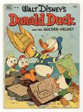 Cover art by Carl Barks. The Golden Helmet, script by Carl Barks; The ducks and a museum curator race Azure Blue, a descendant of the Vikings, to the coast of Labrador to find a golden helmet left by a Viking explorer; once the helmet is saved from Blue, the curator and Donald have visions of ruling the continent. Rigged-Up Lawn Roller; Donald is angry because the nephews have lent his lawn roller. Awash in Success; The nephews sell towels to the victims of an over-active park fountain. 36 pages, full color. Cover price $0.10.