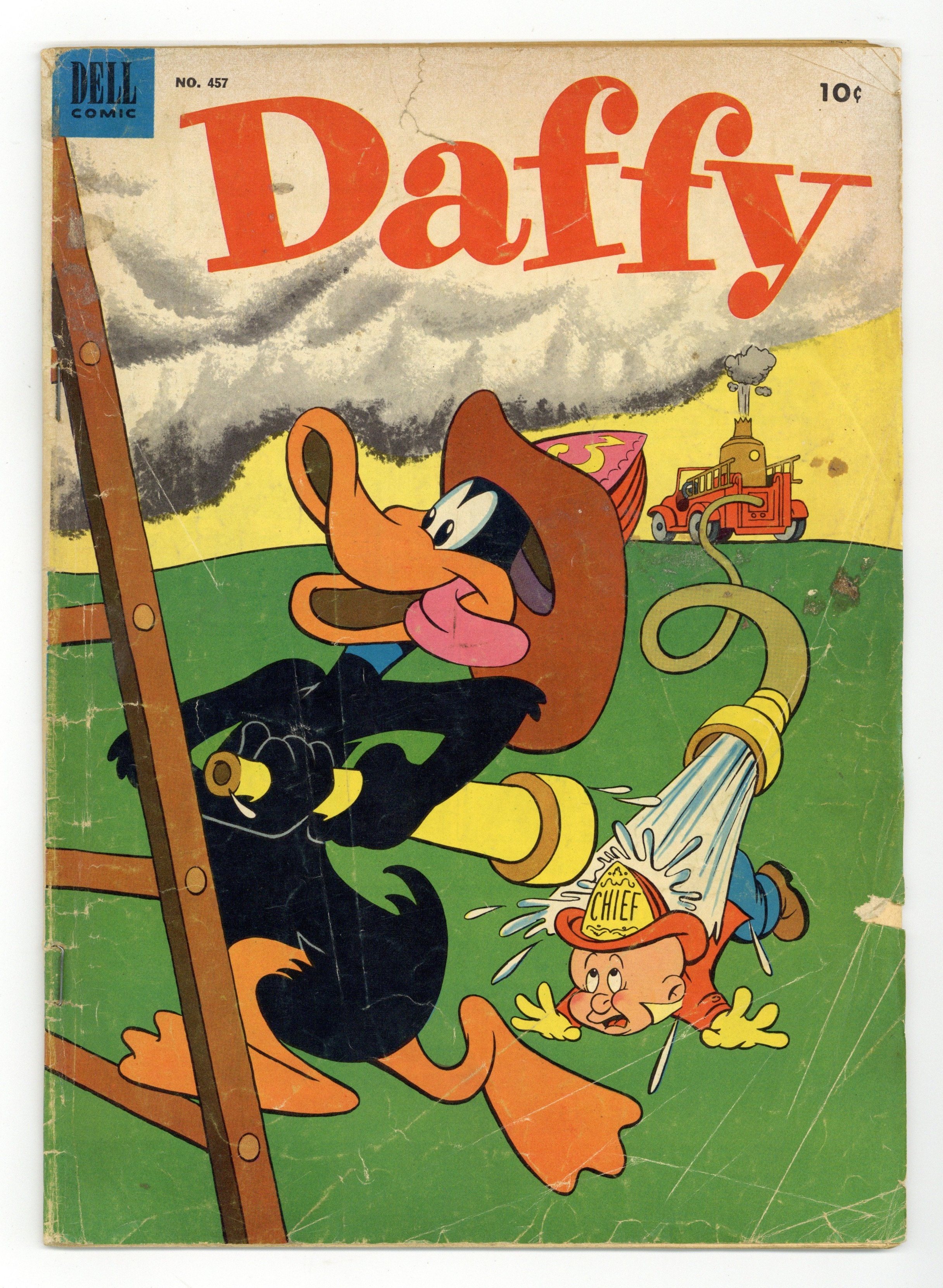 Indicia title is "DAFFY, No. 457." Cover art by Phil de Lara. Vacation by Train, script by Don R. Christensen, art by Phil de Lara; Elmer decides to take a train trip to spend the winter in the South and get away from Daffy; Daffy hides in his luggage and causes havoc when his prank about Elmer having counterfeit money is taken seriously. Six-Gun Gertie, script by Don R. Christensen, art by Phil de Lara; Daffy meets up with "Two-Gun Gertie" in a Wild West town; Gertie is better at shooting, roping, and riding than the men, who are scared of her. Deerhead, script by Don R. Christensen, art by Phil de Lara; Tired of being picked on because he's a duck, Daffy decides to change his identity by wearing a stuffed deer's head; Unfortunately, he forgets it's deer hunting season. Skywriting for Elmer, art by Phil de Lara. 36 pages, full color. Cover price $0.10.