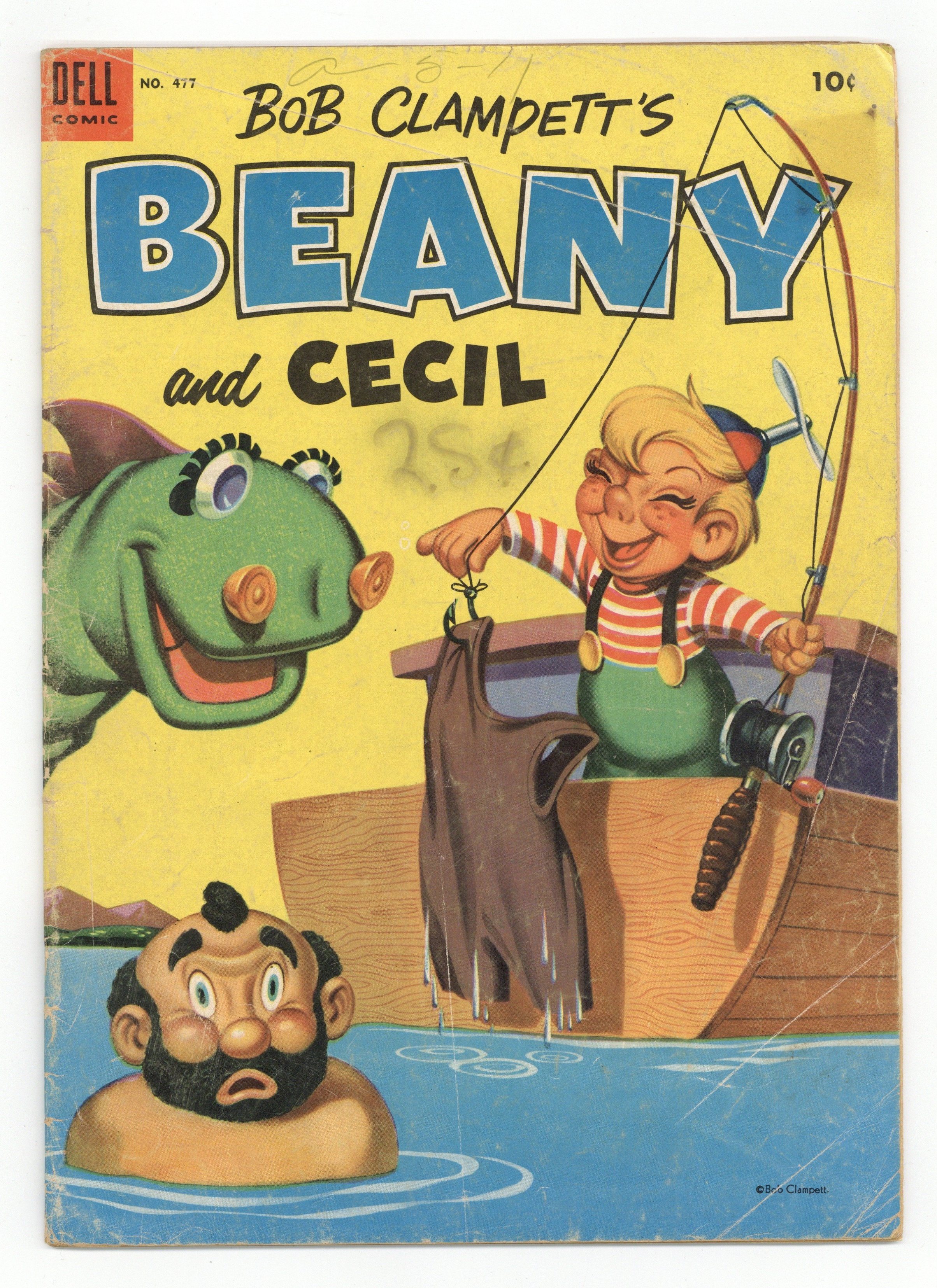 $12.50Indicia title is "BOB CLAMPETT'S BEANY AND CECIL, No. 477." In Search of Caboose Goose Egg, script by Don R. Christensen, art by Jack Bradbury; Beany, Cecil, and the Captain take the Leakin' Lena to Inka Dinka Doo Land in order to find Sir Cuttlebones Jones, the famous bird watcher, who was searching for the Giant Caboose Goose egg and is missing; Dishonest John is along to keep things interesting. 36 pages, full color. Cover price $0.10.