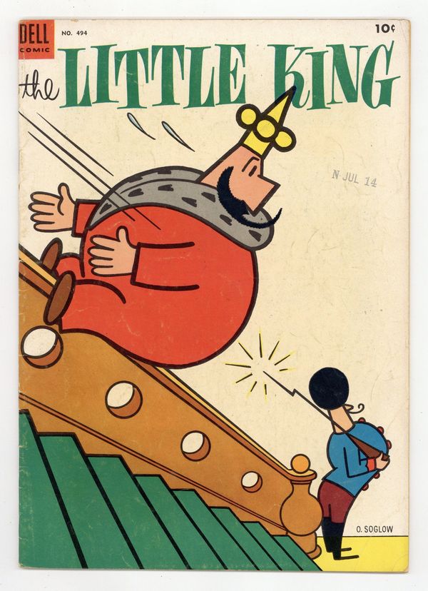 $15.00Indicia title is "THE LITTLE KING, No.494." Designing an Airplane; When the new airplane won't fly, the Little King designs one that will. Changing Identities; The Little King befriends a young boy named Kit and takes him along on his official duties one morning; Tired of all his official duties, the Little King abdicates and names Kit as his successor; After thieves steal the gold in the royal treasury, King Kit declares jelly beans as the currency of the country. The Junior Forest Rangers; The Little King goes to his mountain lodge, only to find that it has been taken over by the Junior Forest Rangers. 36 pages, full color. Cover price $0.10.