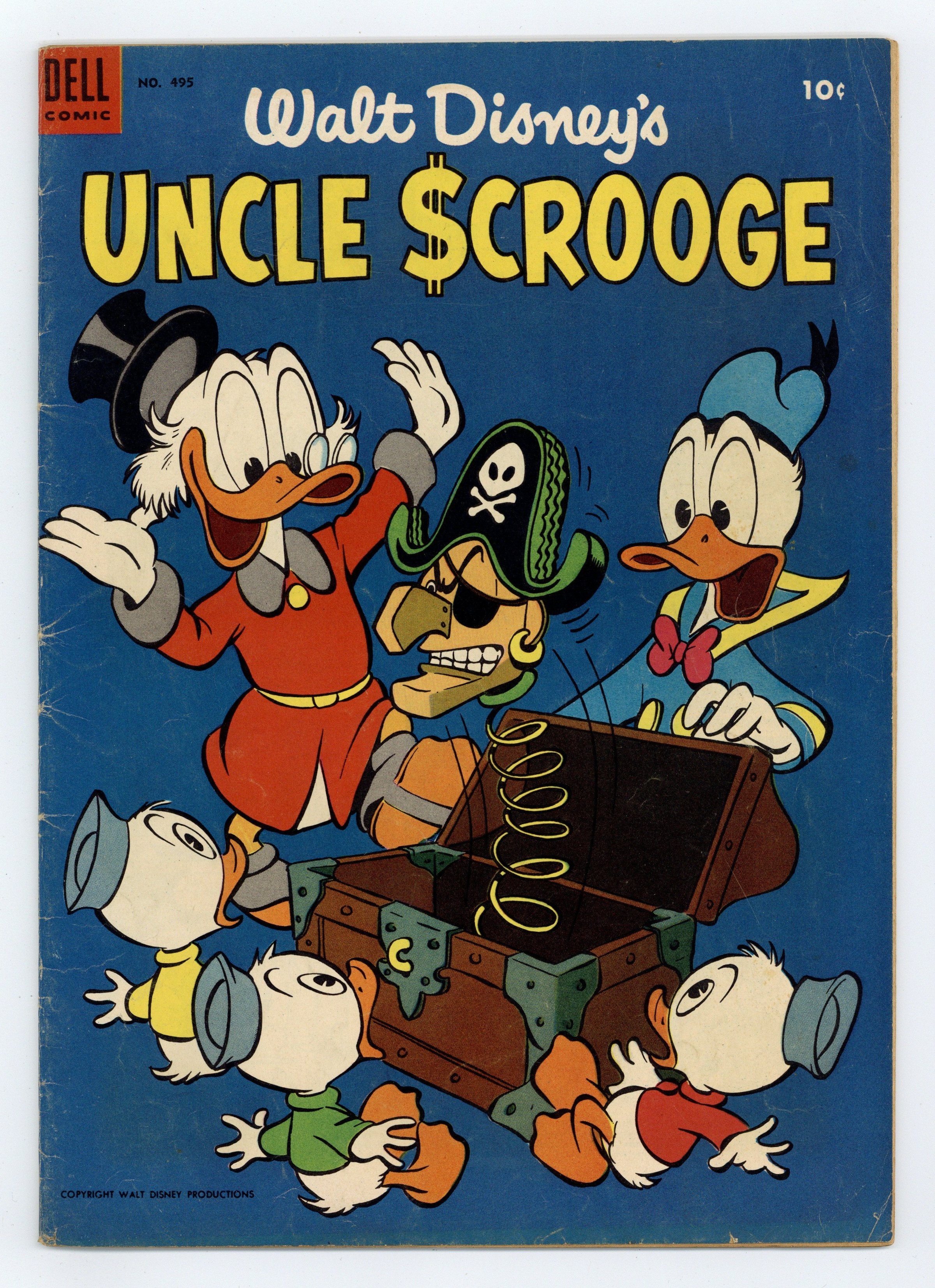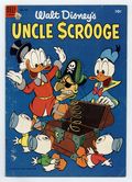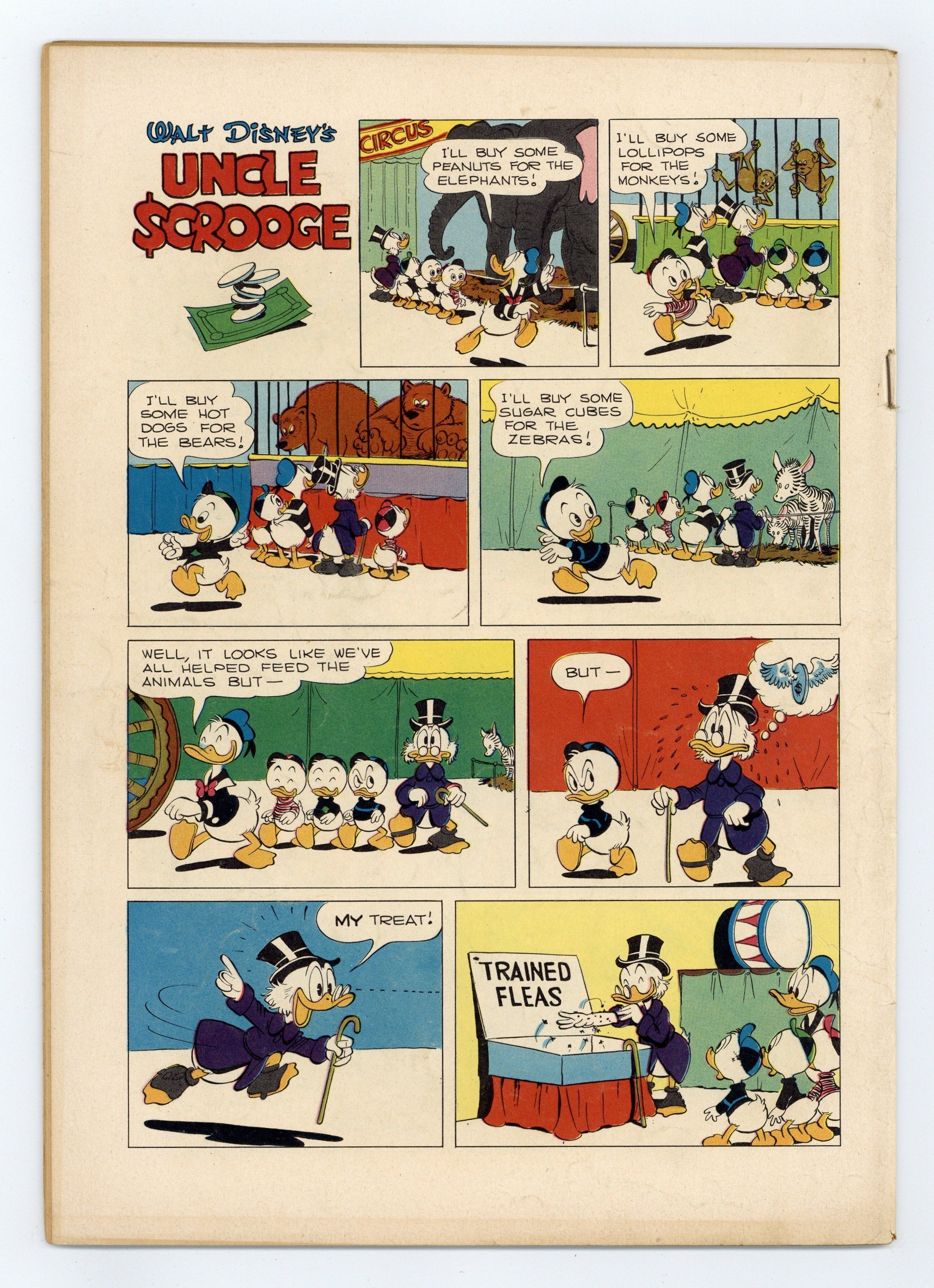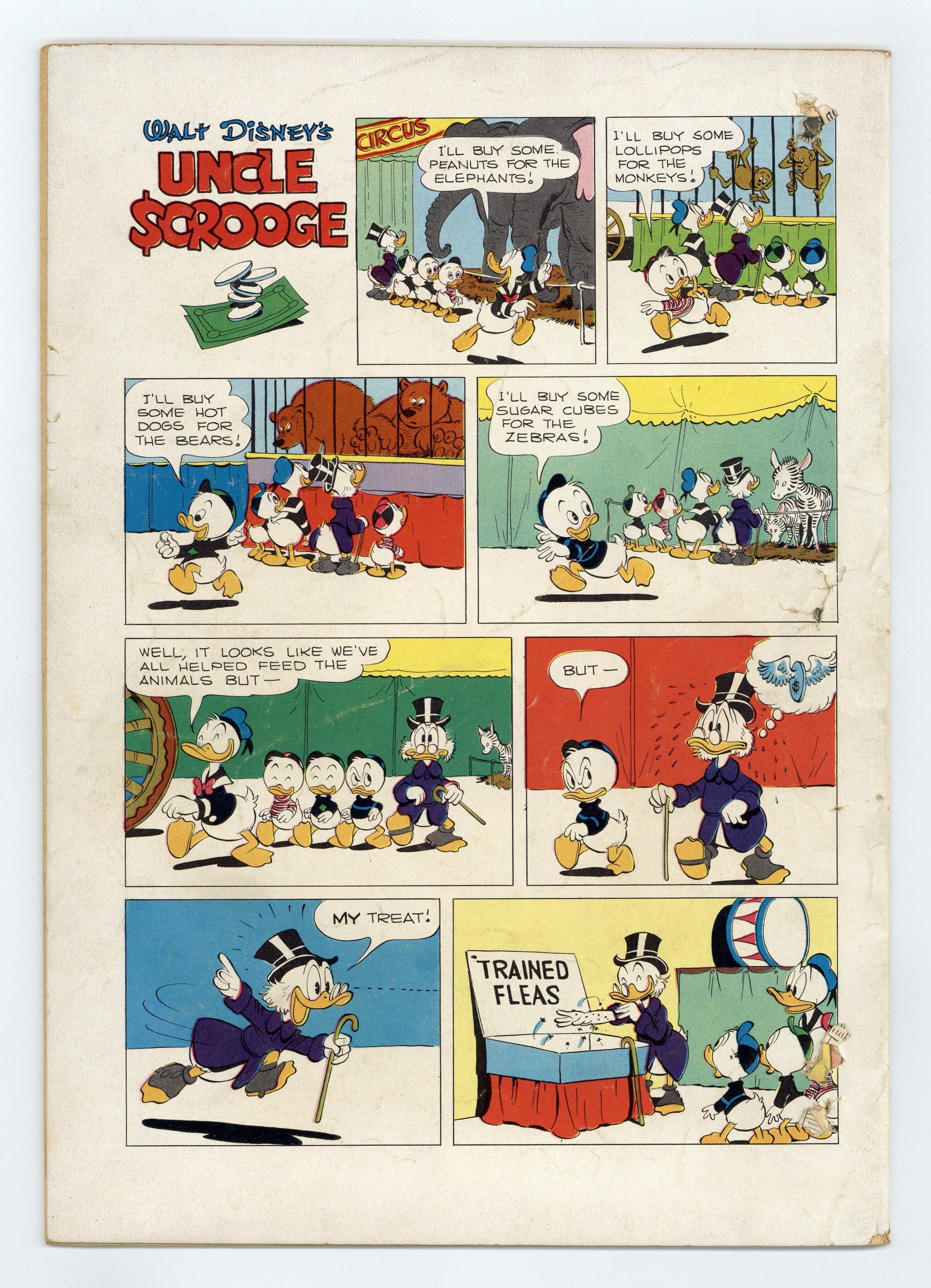 Cover art by Carl Barks. Horseradish Treasure; Scrooge is faced with the loss of his entire fortune to Chisel McSue because, many years before, an ancestor of Scrooge's failed to deliver a case of horseradish to Jamaica, and then failed to give all his property to McSue's ancestor, as provided in a contract; Scrooge can save his fortune only by fulfilling the terms of the original contract, and the ducks set out in a small sailing ship to find the horseradish, which was on a ship that sank in the Caribbean. The Round Money Bin; For safety's sake, Scrooge has his coins changed into greenbacks and stores them in an old water tank, but this fails to stop the Beagle Boys. 36 pages, full color. Cover price $0.10.