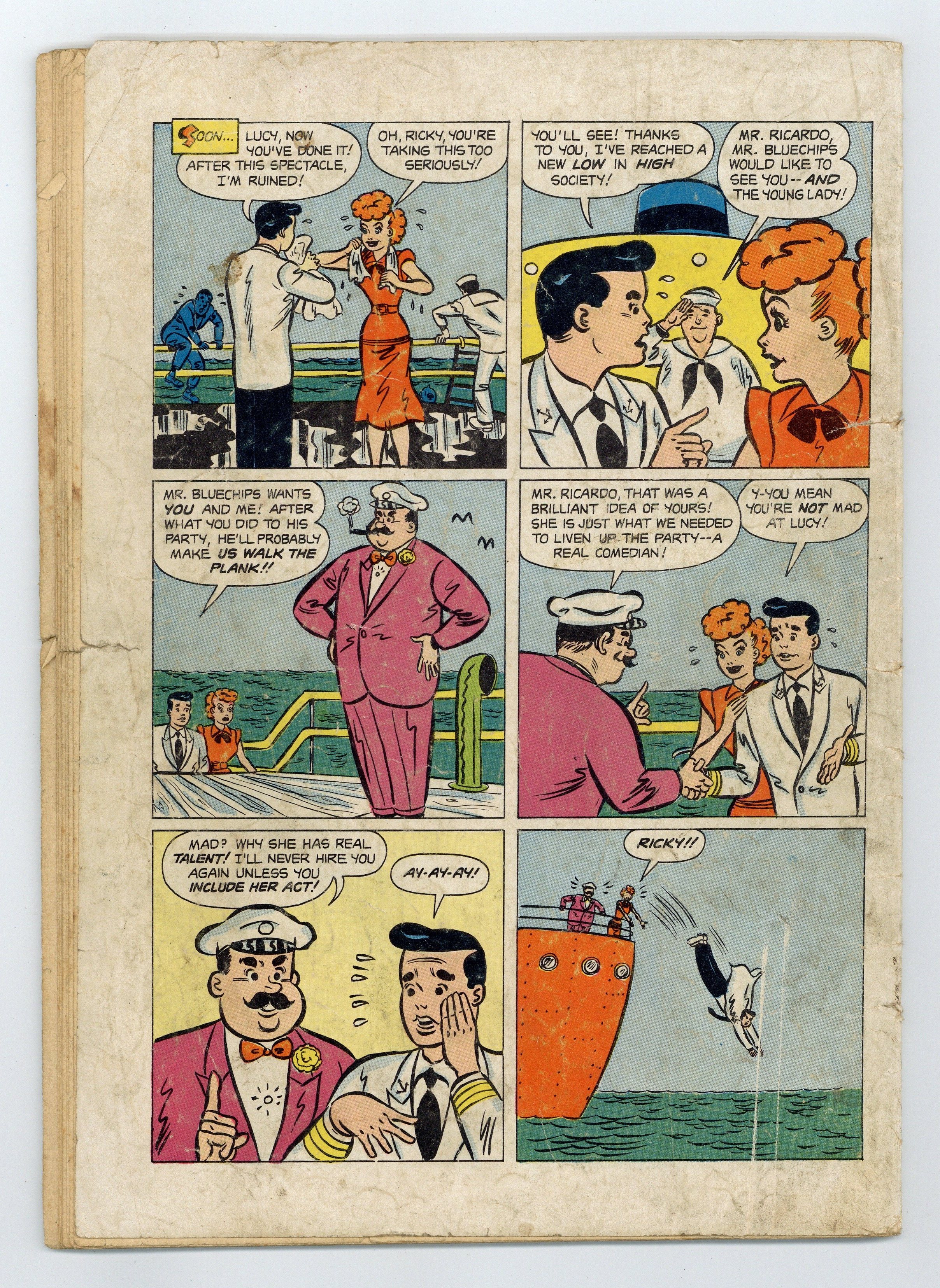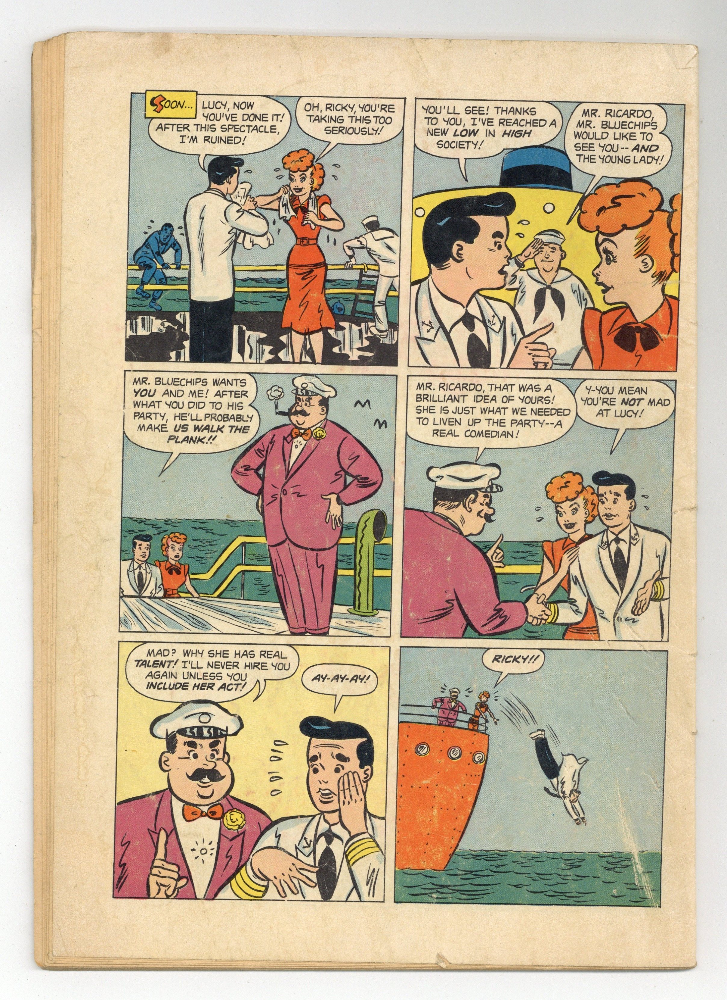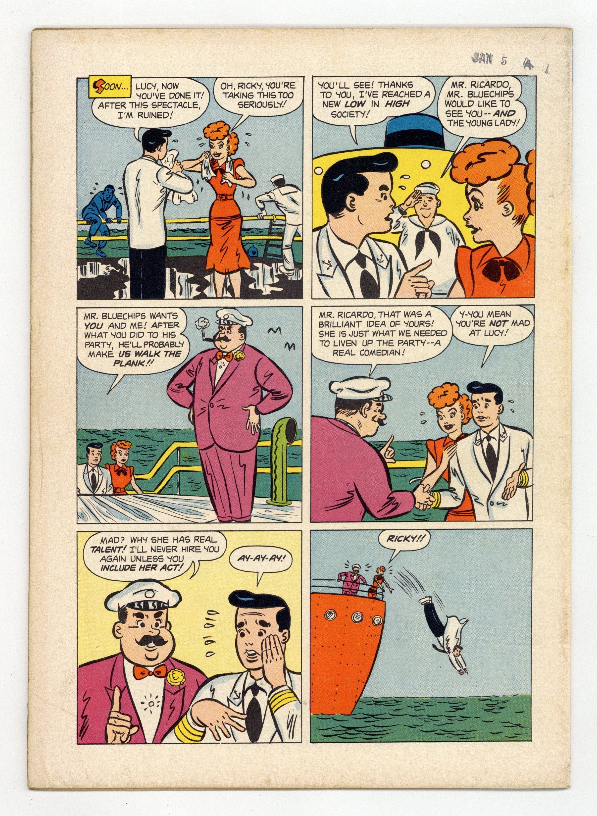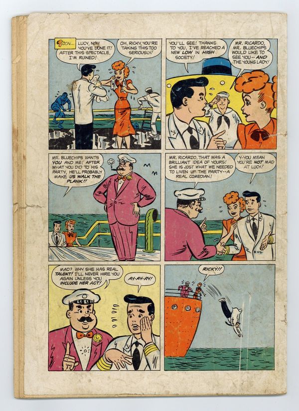 Indicia title is "I LOVE LUCY, No. 535." Lucille Ball photo cover. Intro with four photos from the TV series. The Midnight Snack; Lucy's midnight snacks are giving her hiccups, which are keeping Ricky awake. Suds in Your Eyes; Lucy buys boxes of Fado Soap Flakes looking for the lucky ticket that's included in a box as a prize. Strike Up the Band; Ricky's orchestra gets a job playing a a party on Mr. Bluechip's yacht. Lucy stows away and causes havoc while trying to stay out of sight. Art by Hy C. Rosen. 36 pages, full color. Cover price $0.10.