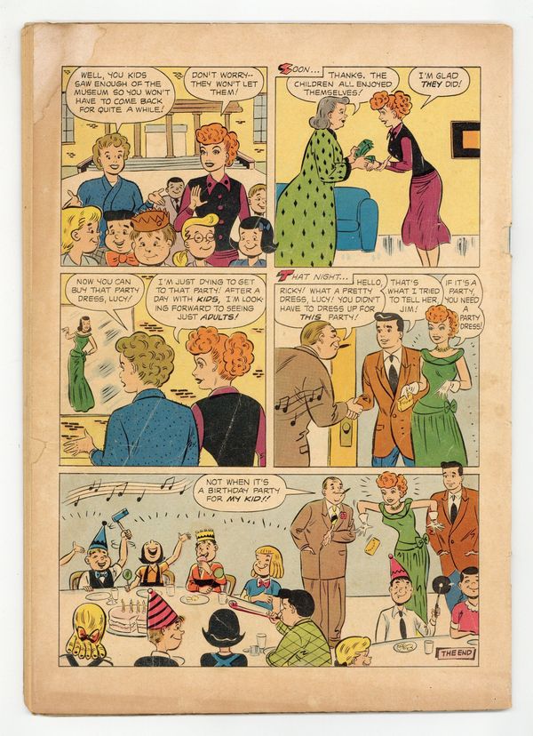 Indicia title is "I LOVE LUCY, No. 559." Photo cover of Lucy Ricardo (as played by Lucille Ball). Shopping Spree; Lucy takes Ricky with her to Lacy's department store to buy some gloves. Follow the Leader; Lucy volunteers Ricky and his band to play at their charity bazaar; The band has a television appearance a half-hour before the bazaar, but Lucy helpfully draws a map to get from the TV station to the bazaar. Child's Play; Lucy needs money to buy a dress for a party, so she fills in as caretaker for ten children on a Saturday. The group causes chaos in a museum. All interior art by Hy C. Rosen. 36 pages, full color. Cover price $0.10.