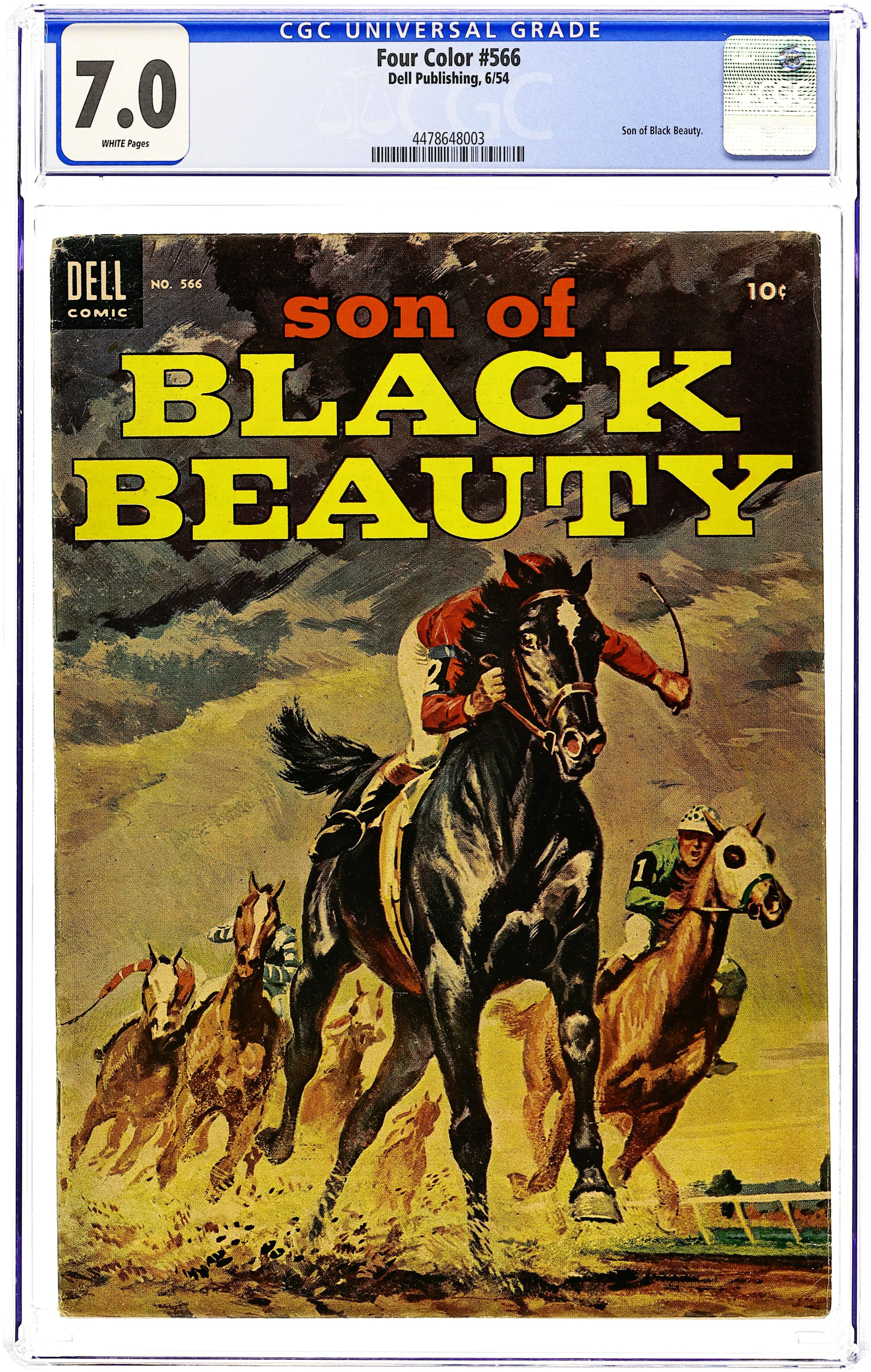 Indicia title is "SON OF BLACK BEAUTY, No. 566." Painted cover art by Sam Savitt. Facts about race horses. Son of Black Beauty, art by Morris Gollub; The trials and triumphs of Son of Black Beauty as he trains to compete in the Championship Cup Steeplechase race. 36 pages, full color. Cover price $0.10.