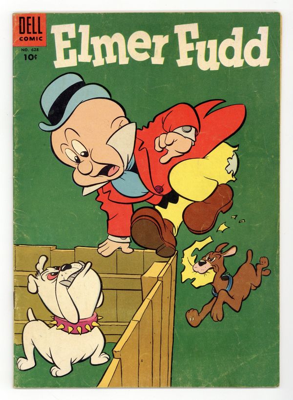 Indicia title is "ELMER FUDD, No. 628." Mysterious Stew Pot; Swami Ronnie throws a magic wishing coin out the car window rather than let Swami Salomi have it; Elmer finds the coin and wishes for a stew pot that is always full of food. A Hair-Raising Story; Daffy tries to trick Elmer into believing "Dr. Daffy's Hair-Grower" really works. Suitcase Scramble; After witnessing a bank robbery, Elmer accidentally switches suitcases with the robbers at a train station. Petty Pet Problems; Elmer needs a pet in order to be chairman of the Mayor's Pet Week activities. The Muscle Man; After Bugs and Cicero laugh at Elmer's attempts to get stronger by lifting weights, Elmer's cousin Delmer comes to visit. All art by Phil de Lara. 36 pages, full color. Cover price $0.10.