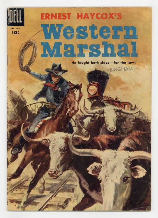 Indicia title is "Ernest Haycox's WESTERN MARSHAL, No. 640." Painted cover art by Sam Savitt. Facsimile of Distinguished Achievement Award given Dell publisher George T. Delacorte, Jr. by Newsdealers Post Number 1169 American Legion on November 14, 1954. Western Marshal and the Iron Horse, script by Paul S. Newman, art by Everett Raymond Kinstler; Dan Mitchell has to put on the Marshal's star again and try to keep the peace between crews laying railroad track and wagon haulers, who are afraid the railroad will put them out of business. 36 pages, full color. Cover price $0.10.