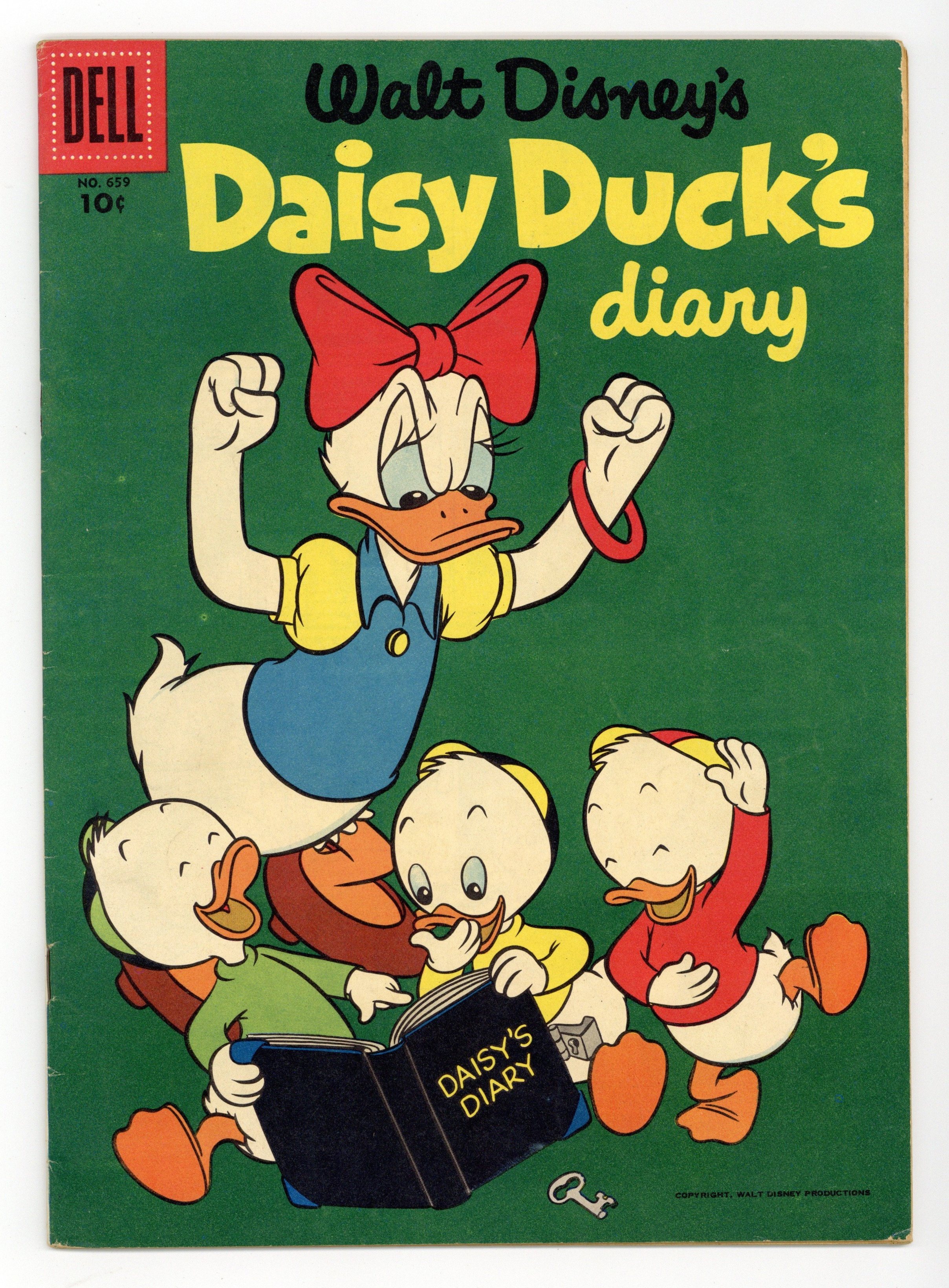 Cover pencils by Tony Strobl. Stories by unknown. Art by Dick Moores. Featuring four untitled tales, plus additional stories on the inside front and inside back covers, as well as the back cover. Second of nine Daisy Duck's Diary Four Color issues. Starring Daisy Duck, Gladstone Gander, Huey, Dewey and Louie, Donald Duck, Clarabelle Cow and Clara Cluck! 36 pages, full color. Cover price $0.10.