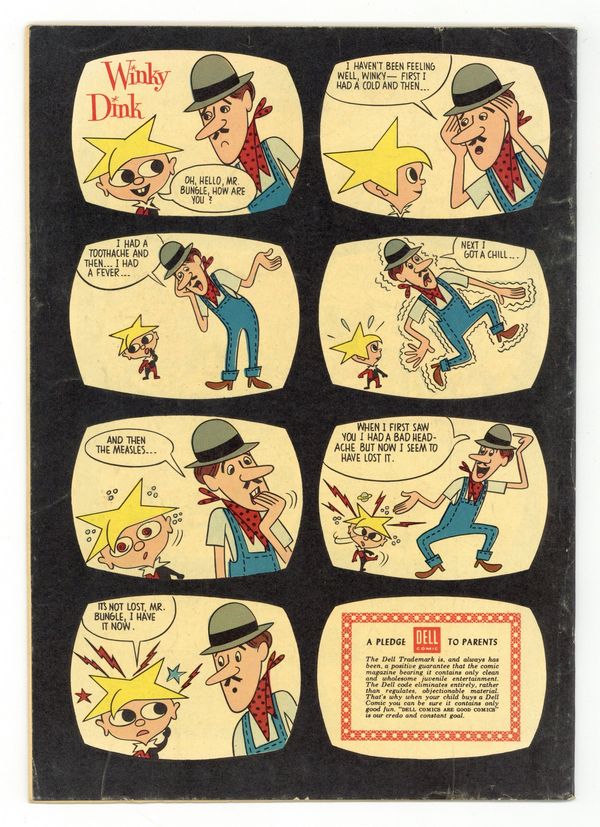 $340.00Indicia title is "WINKY DINK, No. 663." Painted cover art. Winky Dink in the Totem Trail with Dusty Dan; Polecat Pete steals a totem pole from Prof. Throckmorton Z. Bubblehead that contains a secret formula hidden inside. Winky Dink with Mike McBean and His Adventure Machine; Winky goes with Mike McBean and his Adventure Machine back in time to meet Redbeard the Pirate. Winky Dink at the Arctic with Mysto the Magician; Mysto the Magician conjures up a balloon to take Winky Dink and Mr. Bungle to the South Seas, but all three end up in the Arctic instead. Winky Dink and Elmo the Spy: Trail of the Pink Elephant; Winky Dink stows away on a ship where Elmo the Spy is plotting with Vizier Mustafa to do away with the Rajah of Shuddadore. 36 pages, full color. Cover price $0.10.