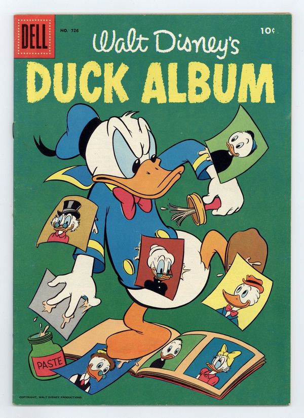 $21.00#726, 1956, 10c. Walt Disney's Duck Album. Version with Juicy Fruit Gum ad on back cover. Donald Duck gets out the photo album which serves as the intro for five stories featuring Uncle Scrooge, Donald Duck, Huey, Dewey & Louie, Daisy Duck, and Grandma Duck. Issue also has one-page gag strips. Story and art credits: unknown. 36 pages, full color. Cover price $0.10.
