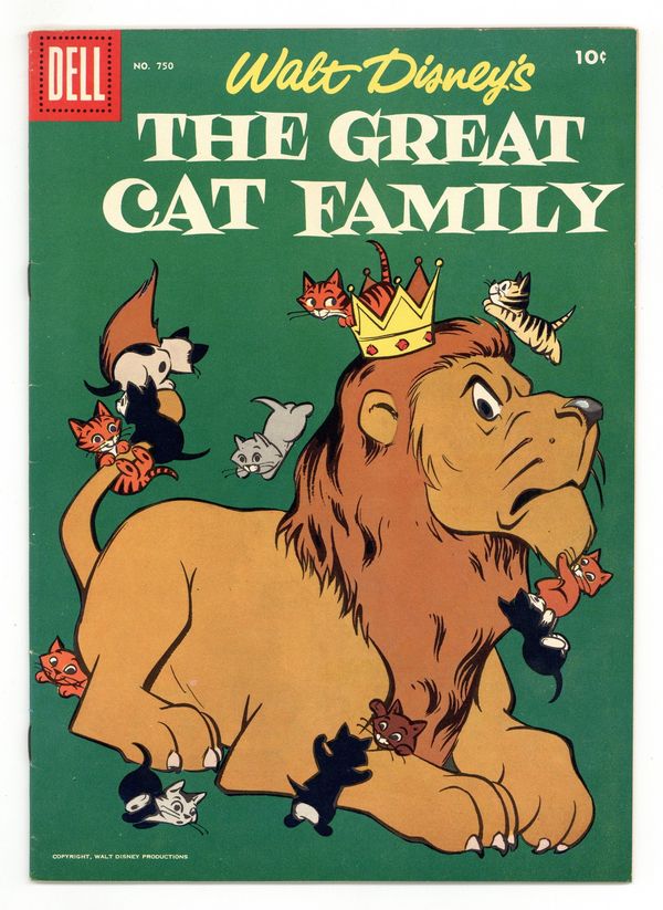Cover by Al Hubbard. Stories by unknown. Art by Al Hubbard and Dick Moores. Featuring the tales "The Great Cat Family" and "Lambert the Sheepish Lion," plus text article "Cats of Jungle and Plain"! Starring Alice in Wonderland, Gus and Jacque, Lucifer, Pinocchio, Geppeto, Figaro and Lambert the Sheepish Lion! (Note: the Lambert story is reprinted from Dell Giant Silly Symphonies (1952) #2.) 36 pages, full color. Cover price $0.10.