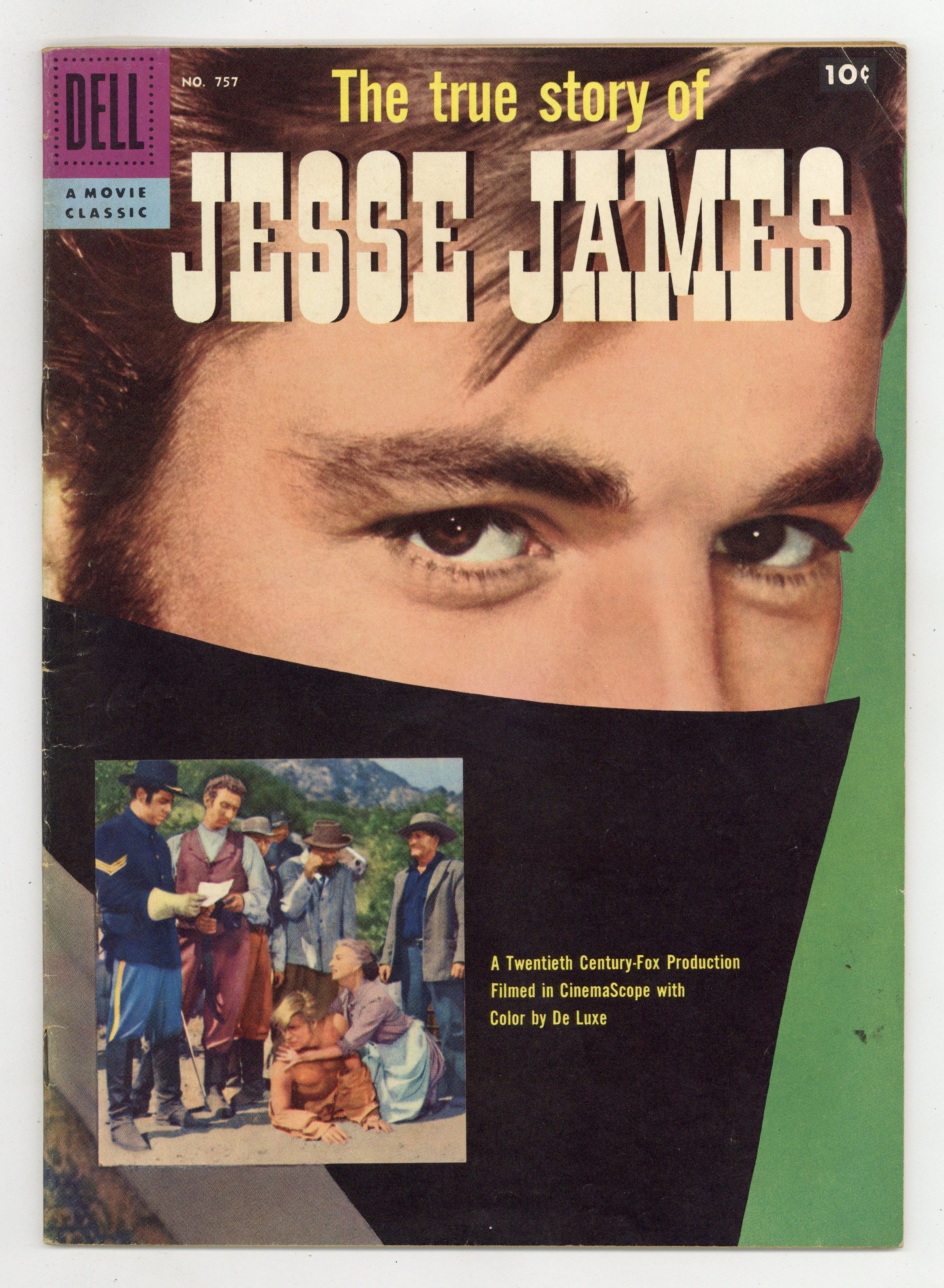 Indicia title is "THE TRUE STORY OF JESSE JAMES, No. 757. Cover photo of Jesse James (as played by Robert Wagner). Intro featuring five photos from the movie and a partial cast list. The True Story of Jesse James, art by Jesse Marsh; The last 18 years of Jesse James' life, mostly told in flashbacks. Covers his years with Quantrill's Raiders, his life of crime, the Northfield, Minn., bank robbery that proved the gang's undoing, and finally his death from being shot in the back by Bob Ford. Adapted from the 1957 Twentieth Century-Fox movie "The True Story of Jesse James." 36 pages, full color. Cover price $0.10.